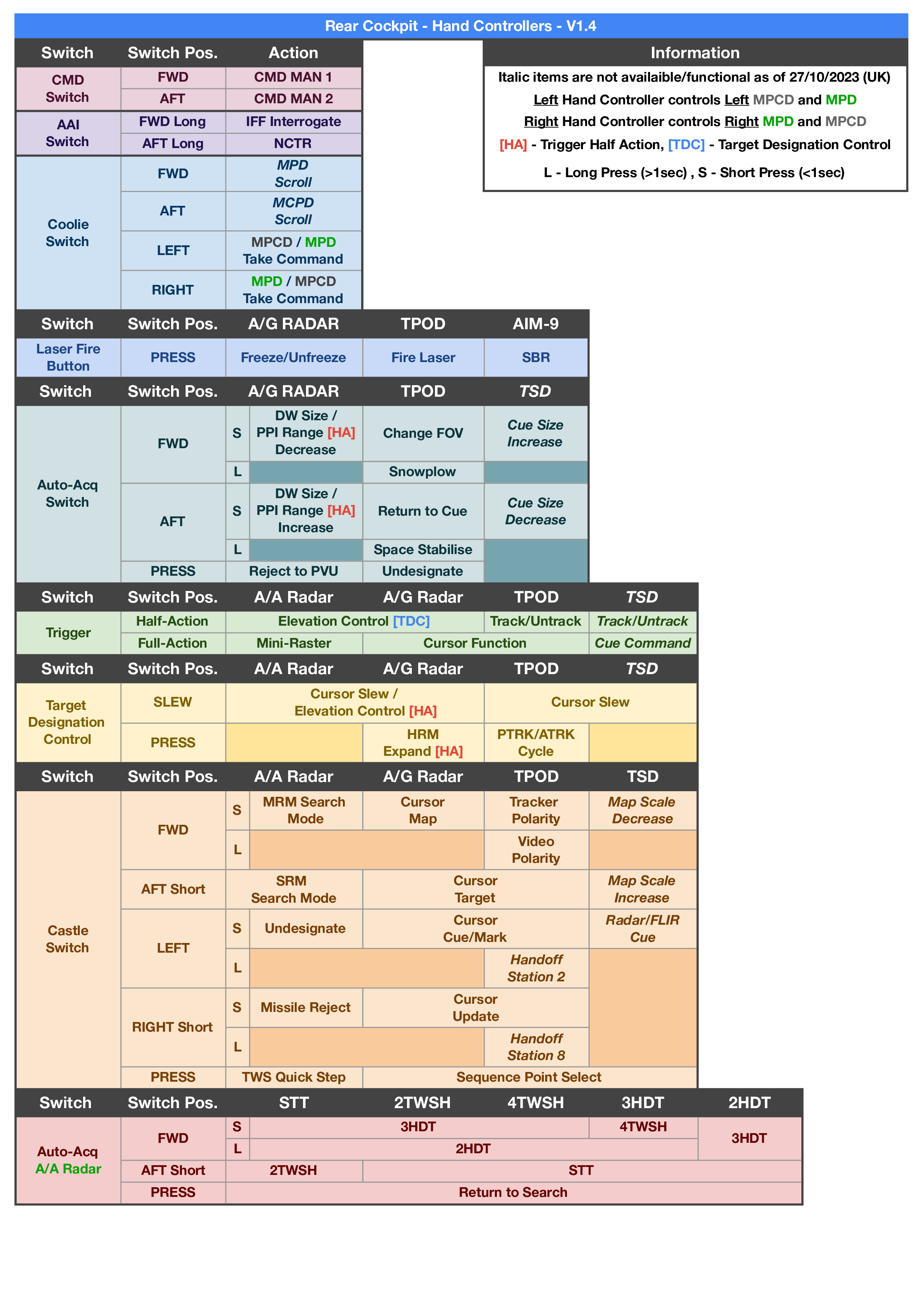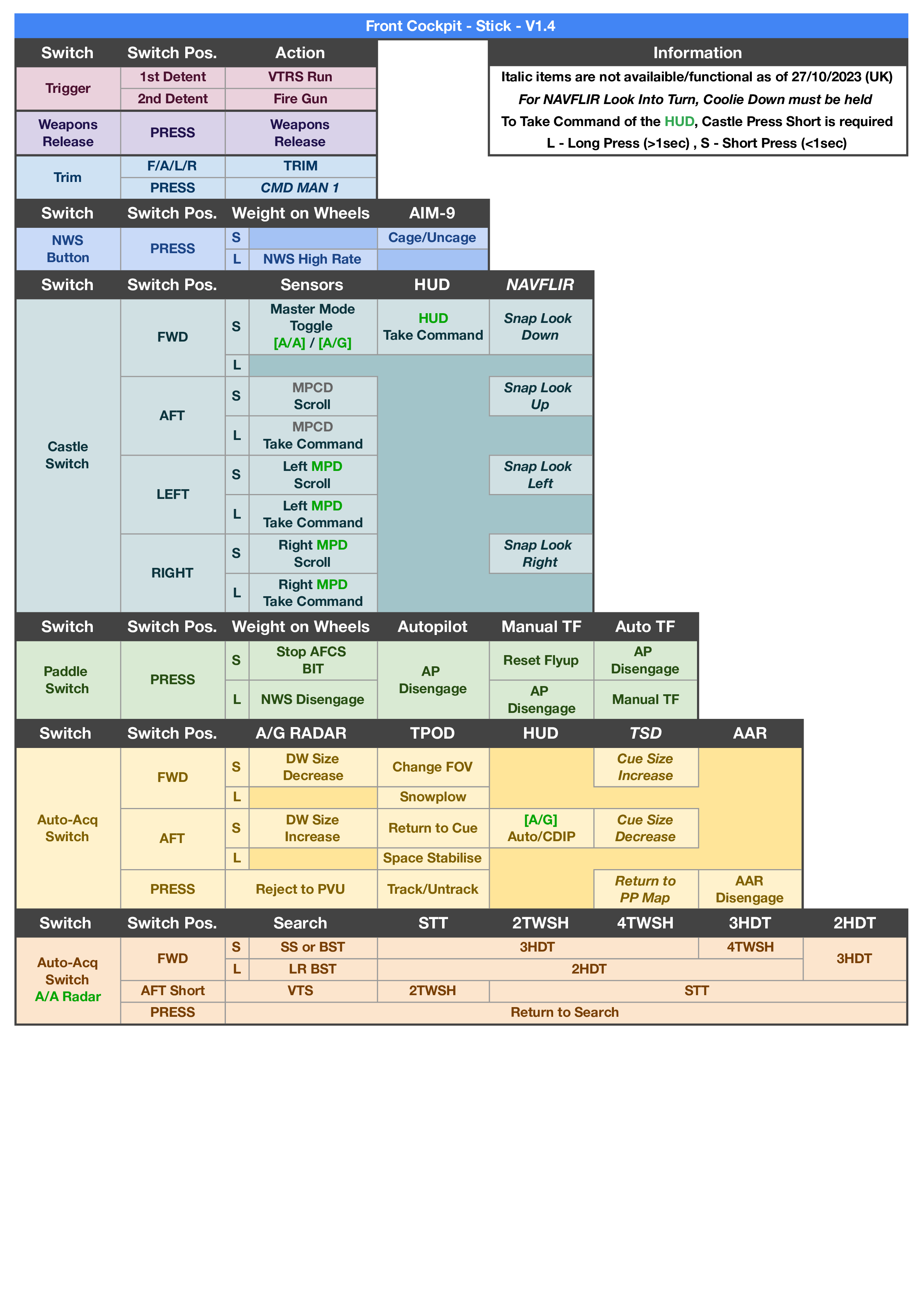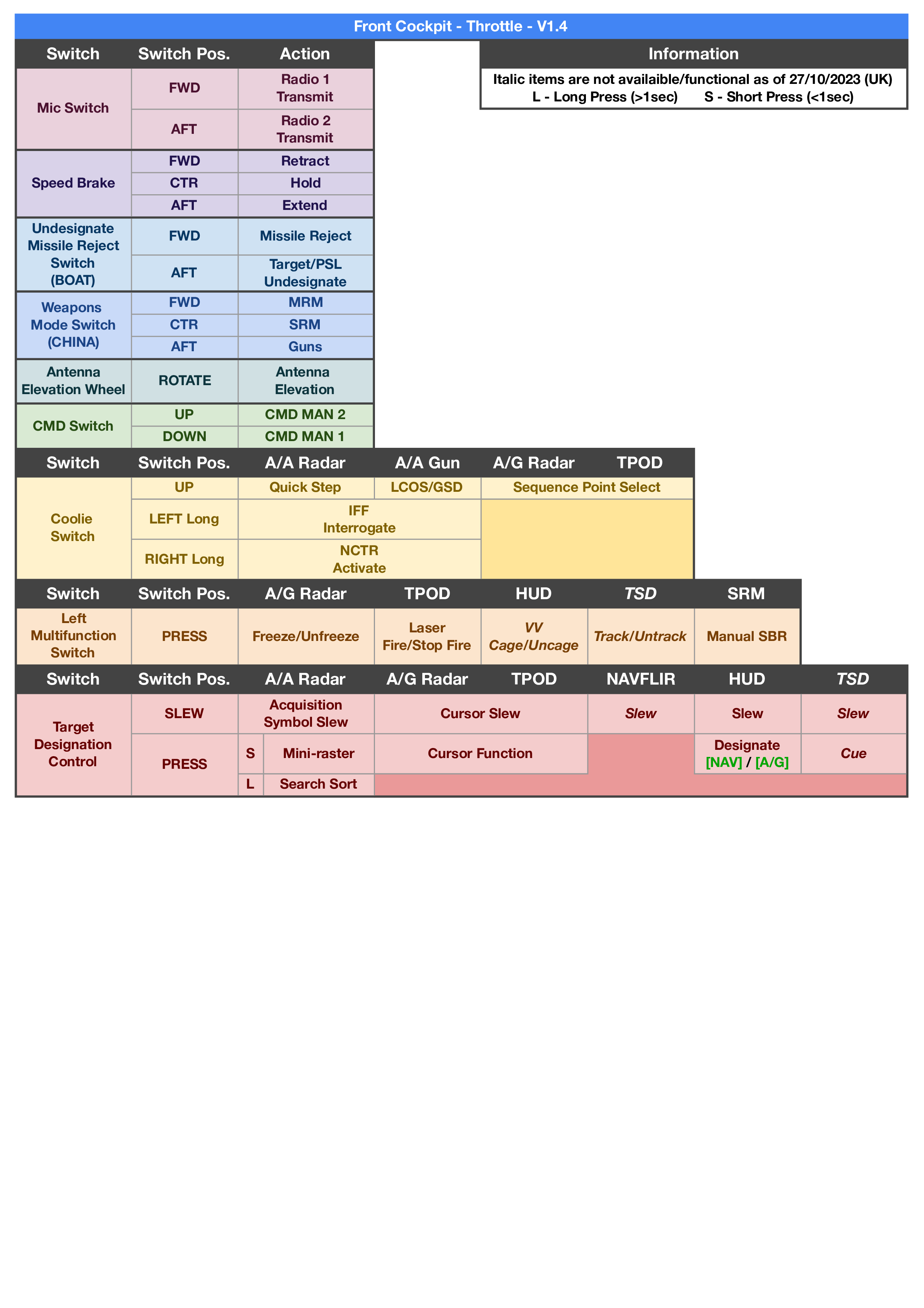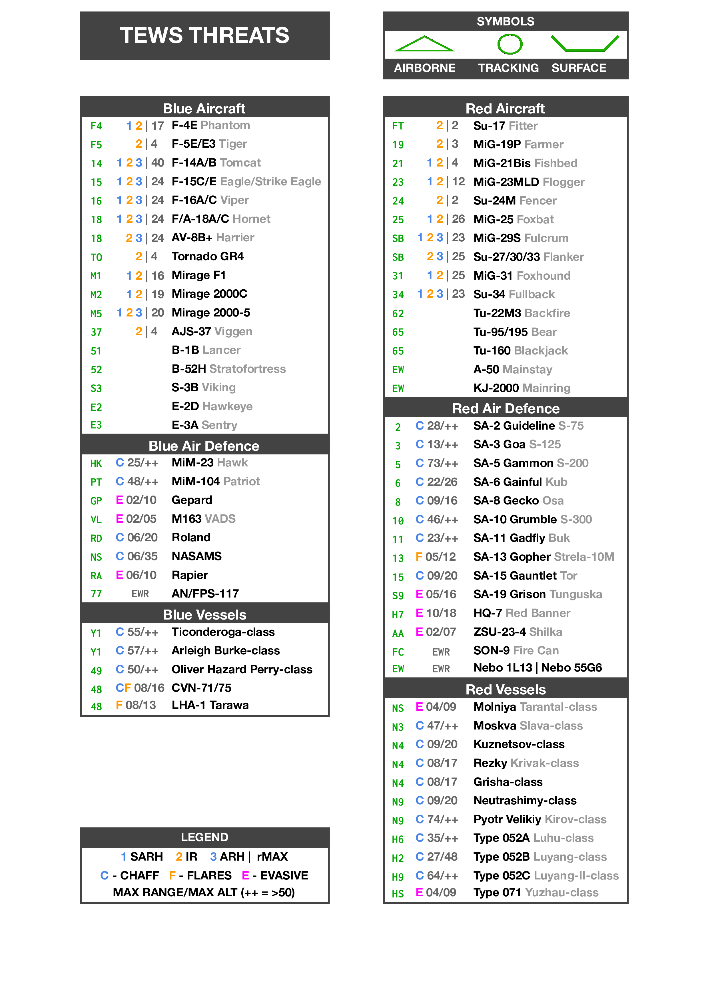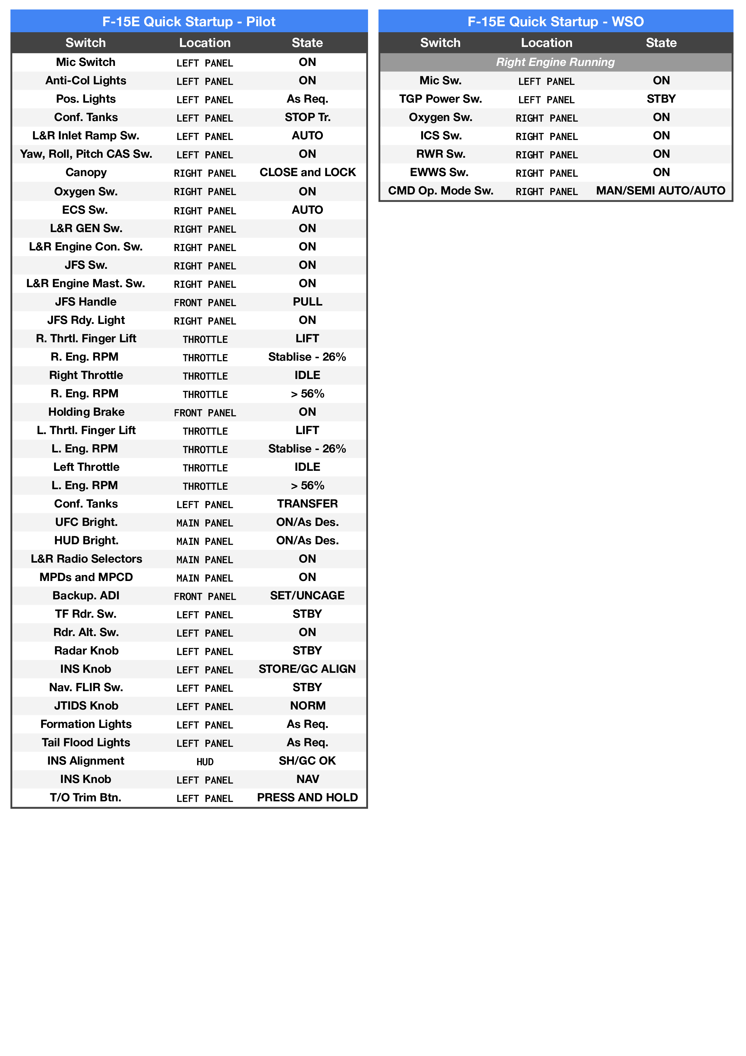F-15E HOTAS Commands, TEWS Threat Chart, and Quick Start Checklists