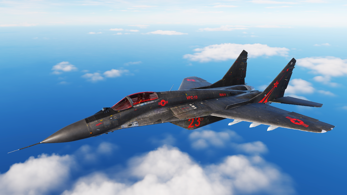 Fictional dark VFC-13 skin for the Mig-29S with tinted glass and English/Darkened cockpit and two-digit dynamic board numbers. OvGME ready, IC Compliant.