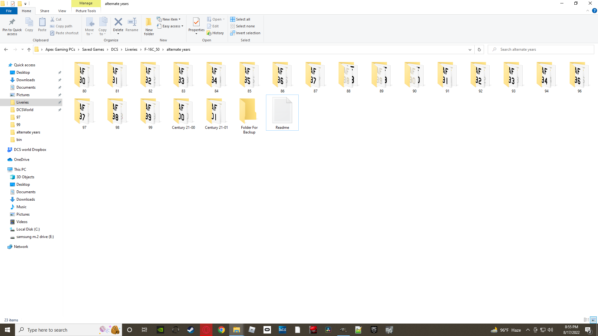 This is a folder containing BORT numbers for every year the f 16 was produced between 1980(F-16A Blk. 15) - 2001(F-16C Blk. 52). Fairly simple to explain except for how to implement it into your skin, there are tutorials and instructions but in short, if you want to implement this into a skin that doesn't have a BORT number by default, you have to go into the description document and find any line with the name of the alternate year you change the line with the name in it to "false" instead of true if its not already, also its easy to implement them to a skin that already has a BORT file, all you have to do is rename the alternate year file to the native file you want to replace because it might differ slightly. drop it in and get rid of the old files and boom!! another thing is that the year 95 doesn't show up in the screenshot but is there in the file.