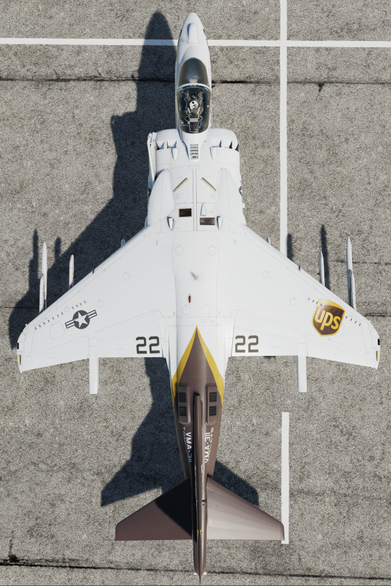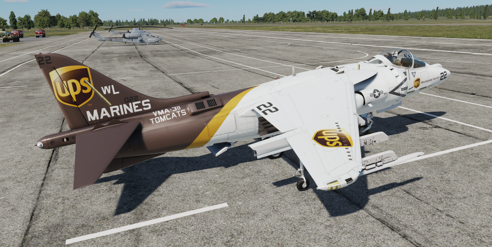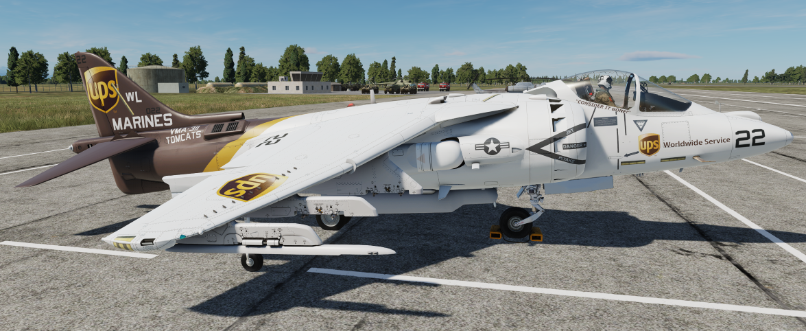 Fictional Livery for Rapid Munition Delivery Services provided by UPS.  UPS is known as a worldwide delivery service, the same goes the USMC AV-8BNA.  Packing ten GBU-38's, the UPS Harrier is nicknamed the "Bomb Truck" and "Consider It Gone".