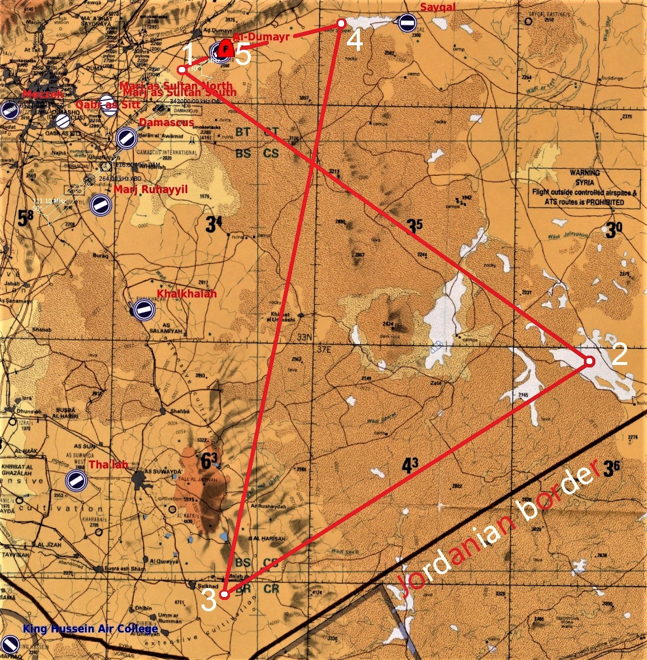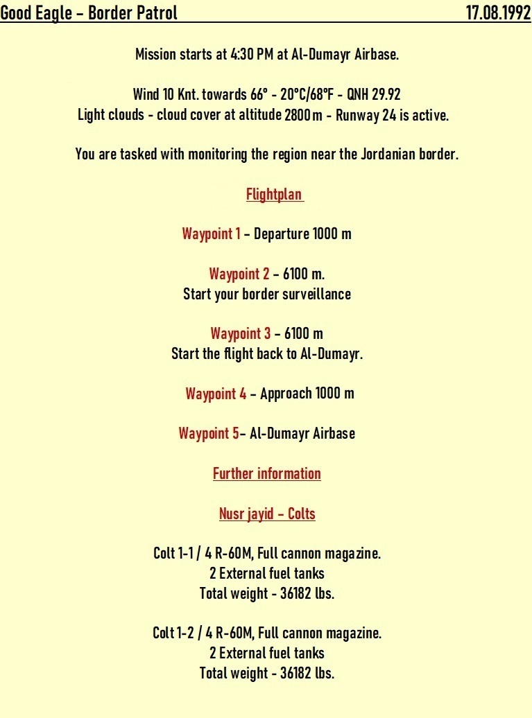 This is a training mission. You start with your wingman at Al Qusayr Airbase. Then you have to fly over the ark station near Al-Qaryatain. From there you continue towards Palmyra. Targets are placed in a box there. You fly into the box. Ideally, you should destroy all targets (your wingman is allowed to help). The targets are marked by green and red smoke as soon as you fly into the box. Finally, you have to fly over Tiyas airbase and then back to Al Qusayr Airbase.