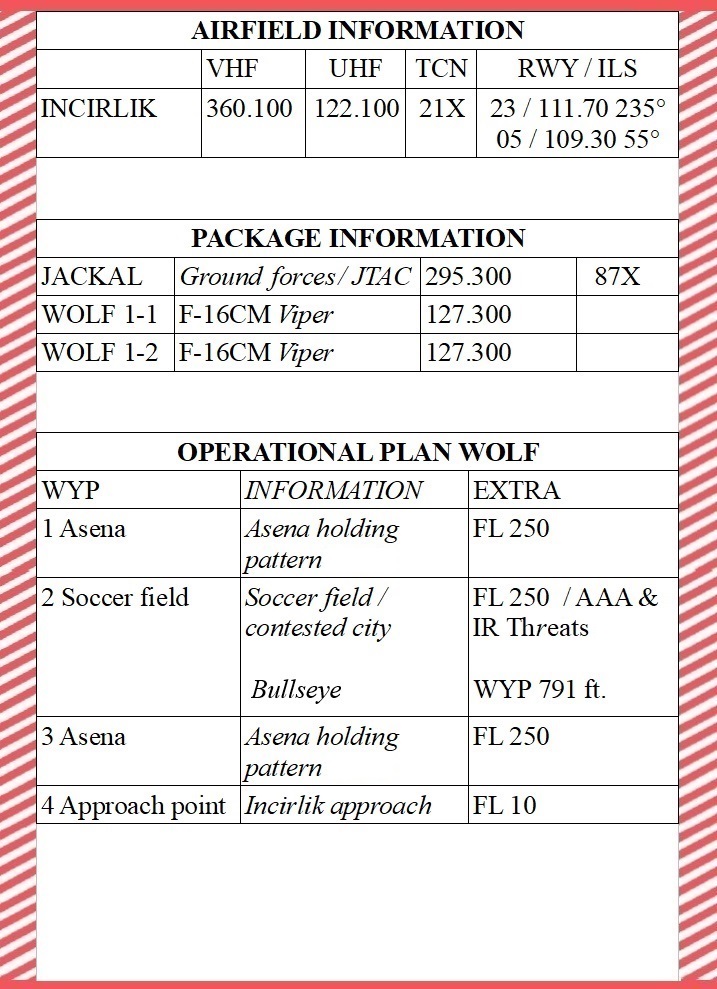 This fictional mission takes place in October 2015. Operation Inherent Resolve is in progress. You lead an element of two Vipers on patrol along the Syrian border.