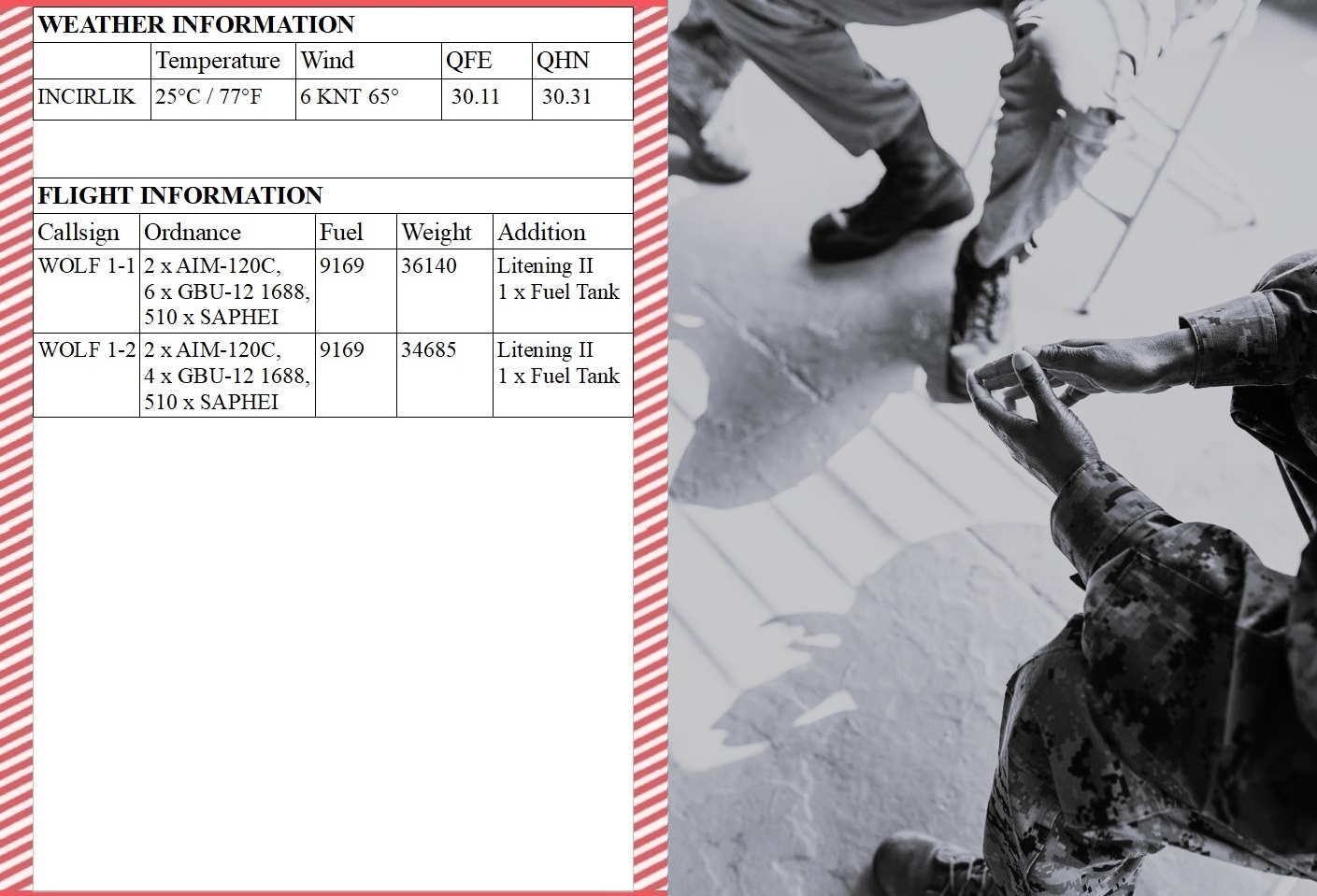 Countless missions were flown during Operation Inherent Resolve. In this fictional scenario, you and your wingman are ordered to Prince Hassan Airbase. This is rather unusual, as the base was used more by French and other allied forces than by US units. Intel is certain to have discovered a secret drone and explosives production facility north of the base in Syria. You and your wingman are sent to take out the production site with Snake Eyes.