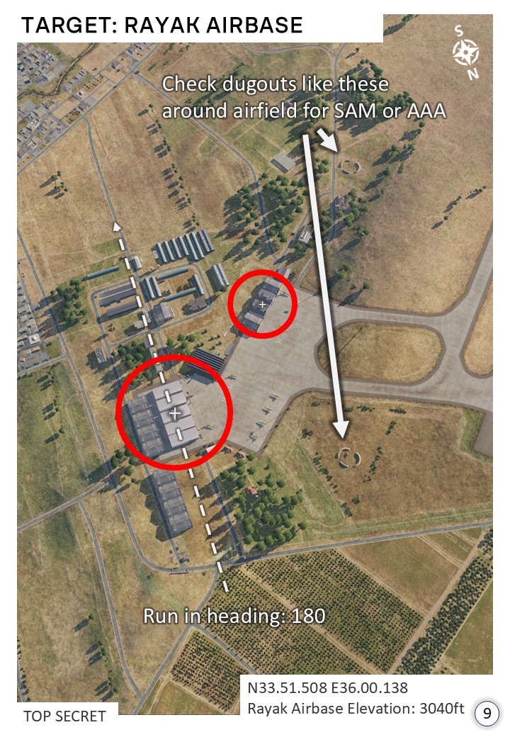Enemy repair facilities are in three hangars close to the parking site. Additional fuel storage has been built in the same area. Destroy as many of these buildings as you can.