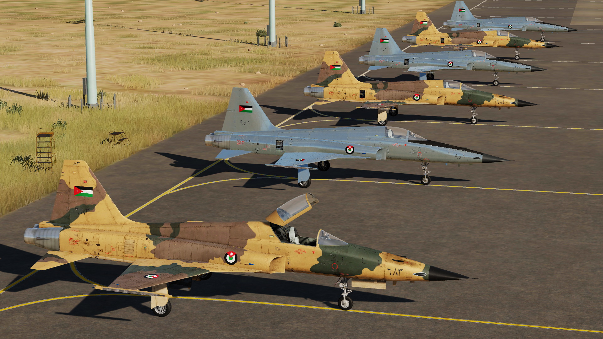 3 sets of skins for the F-5E2 Tiger II in Royal Jordanian Air Force texture (RJAF).