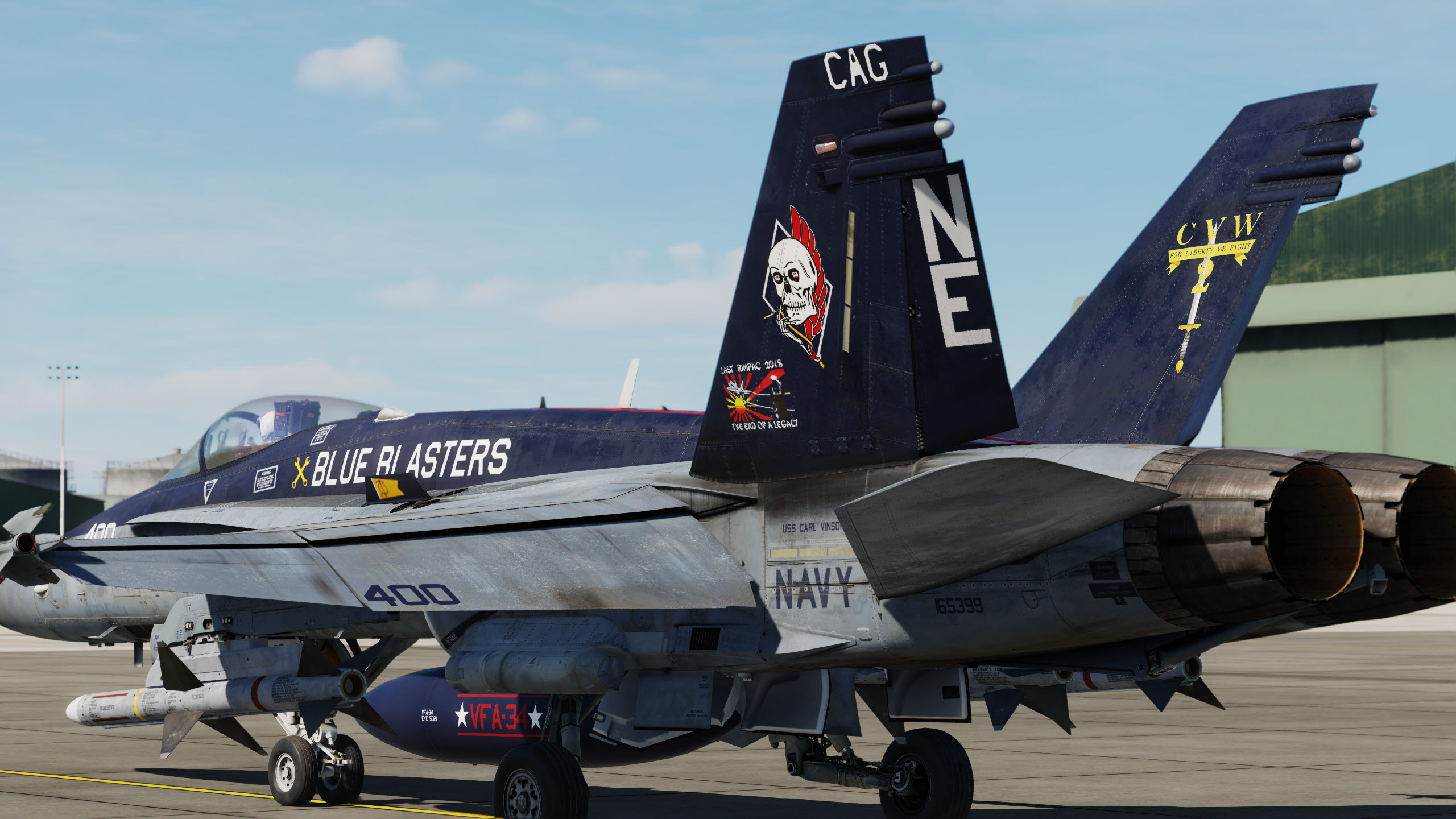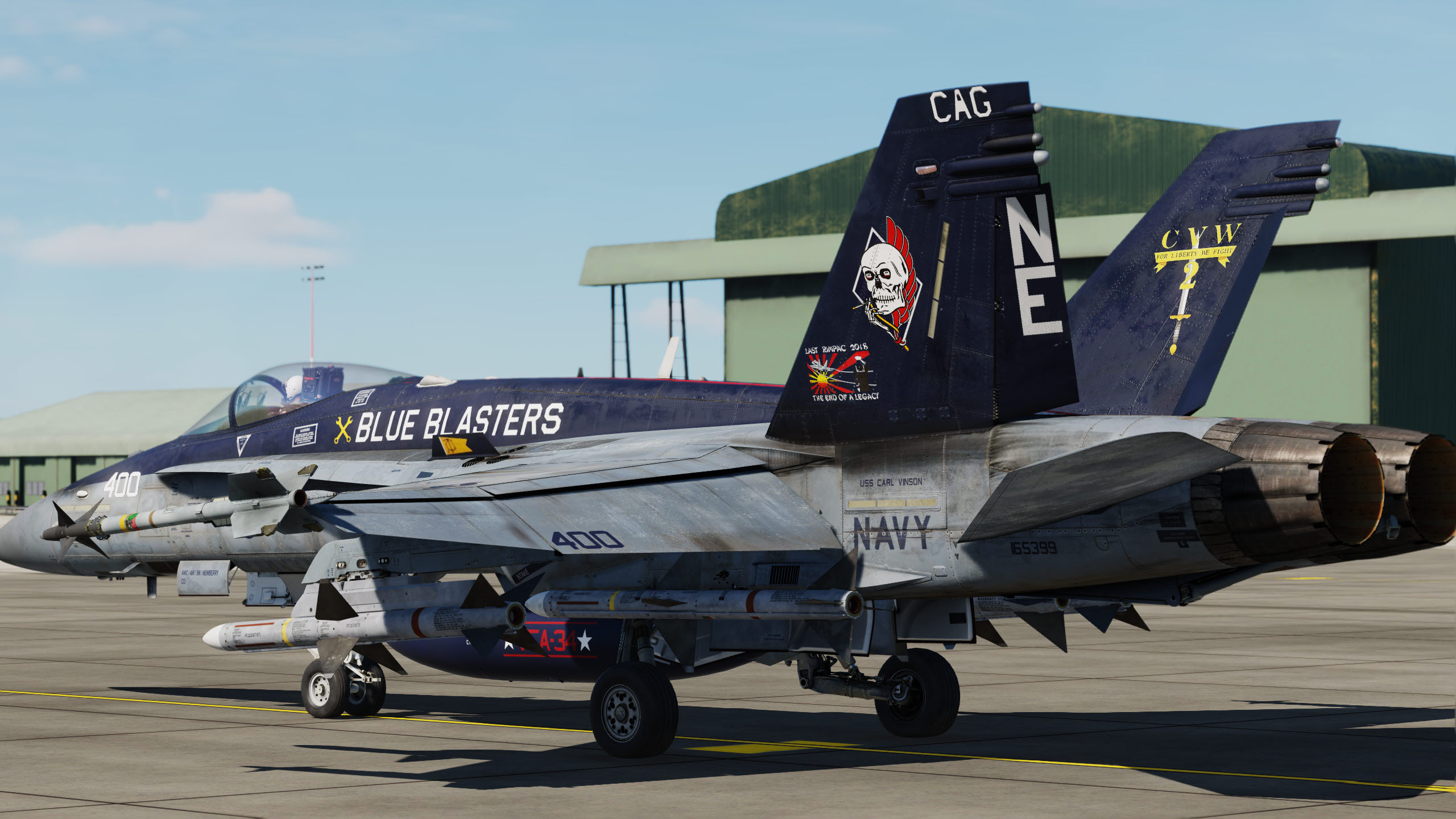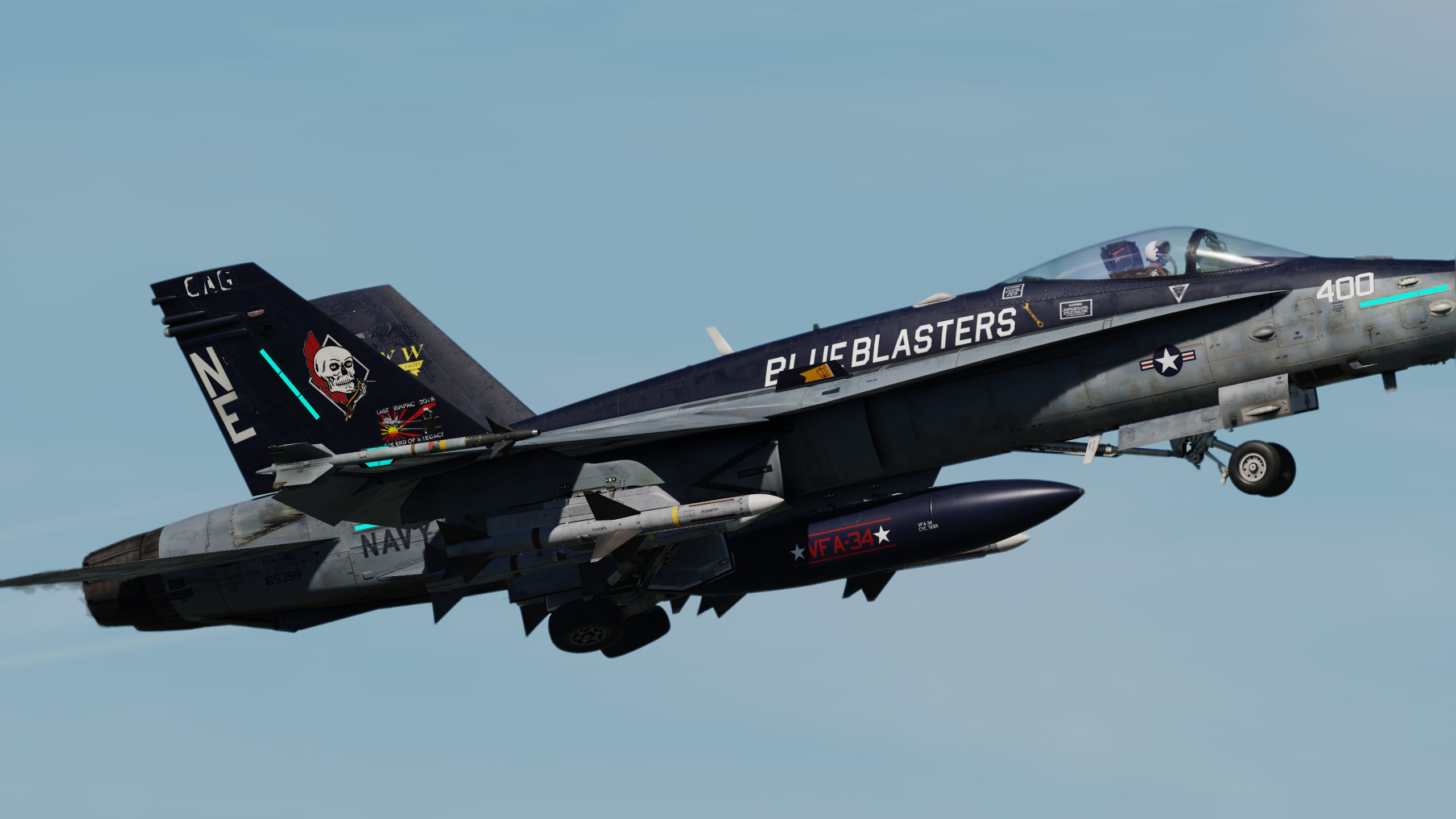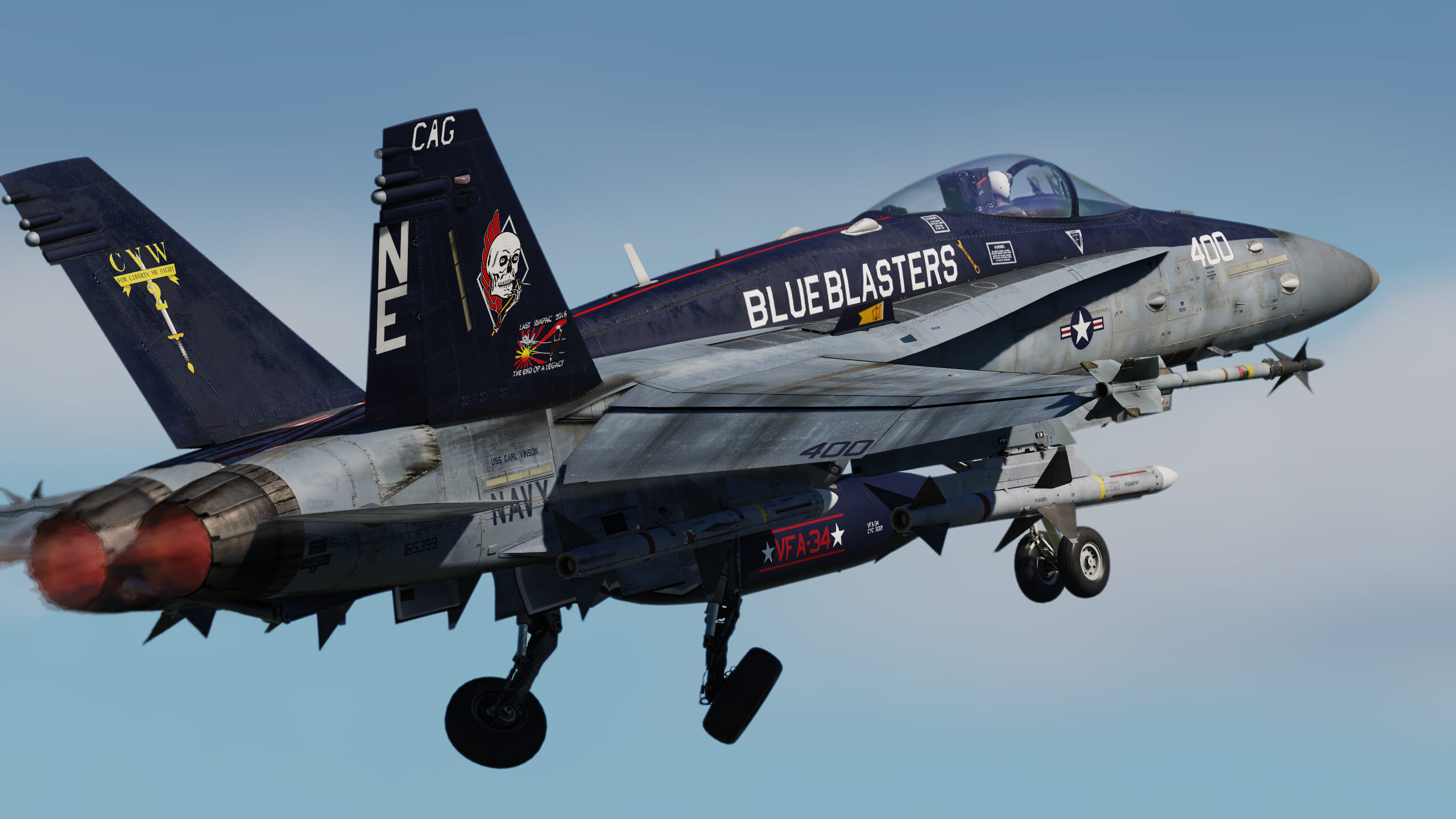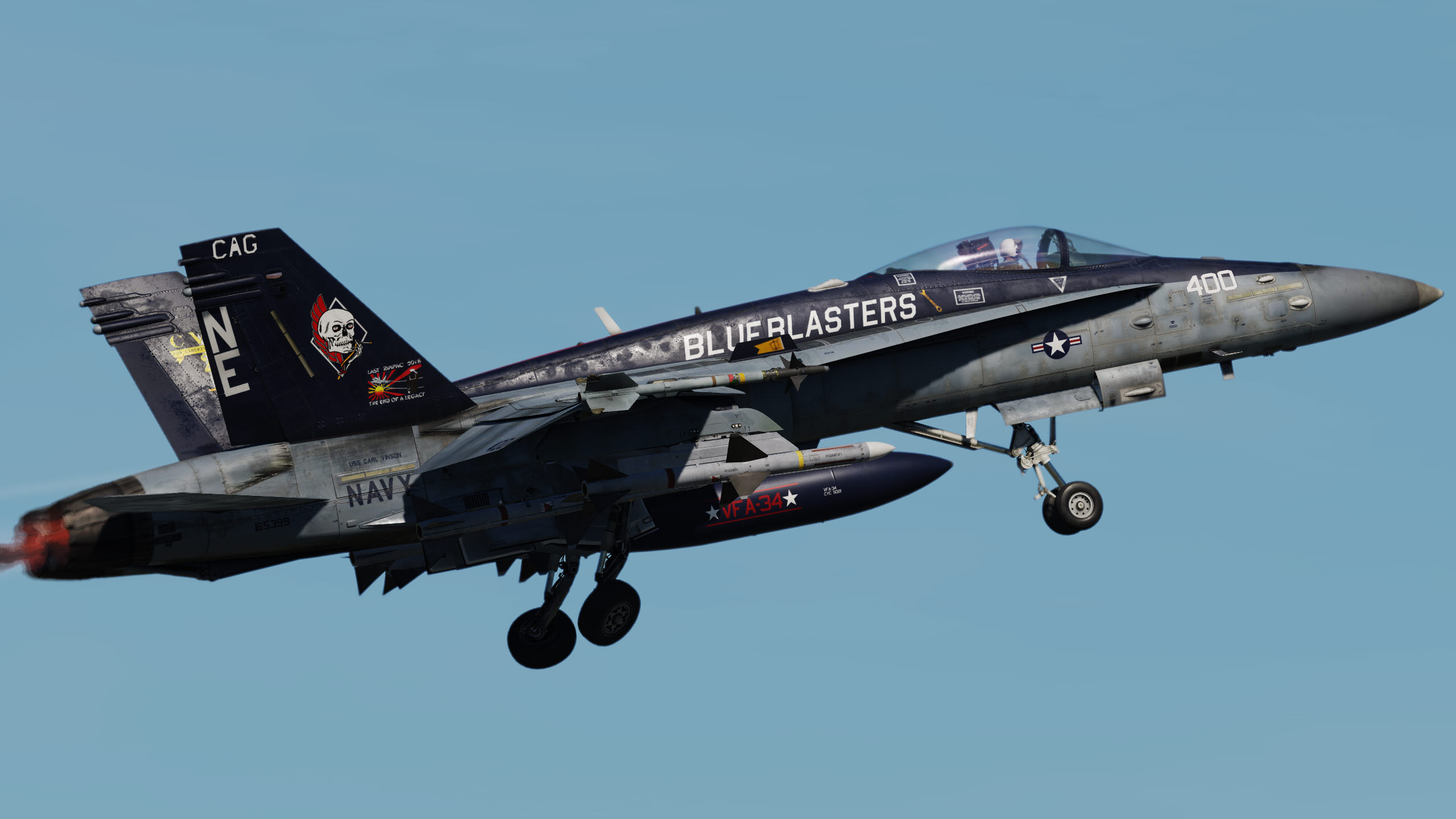 A U.S. Navy McDonnell Douglas F/A-18C Hornet (BuNo 165403) assigned to Strike Fighter Squadron 34 (VFA-34) "Blue Blasters" flies near the aircraft carrier USS Carl Vinson (CVN-70) over the Pacific Ocean on 20 March 2018. VFA-34 was assigned to Carrier Air Wing 2 (CVW-2) aboard the Carl Vinson for a deployment to the Western Pacific since 5 January 2018. Note that his aircraft was the personal aircraft of the "Commander Air Group" (CAG). The small insription on the tail refers to the fact that this deployment of VFA-34 was the last deployment of a U.S. Navy squadron equipped with the F/A-18A/C ("legacy") Hornet.