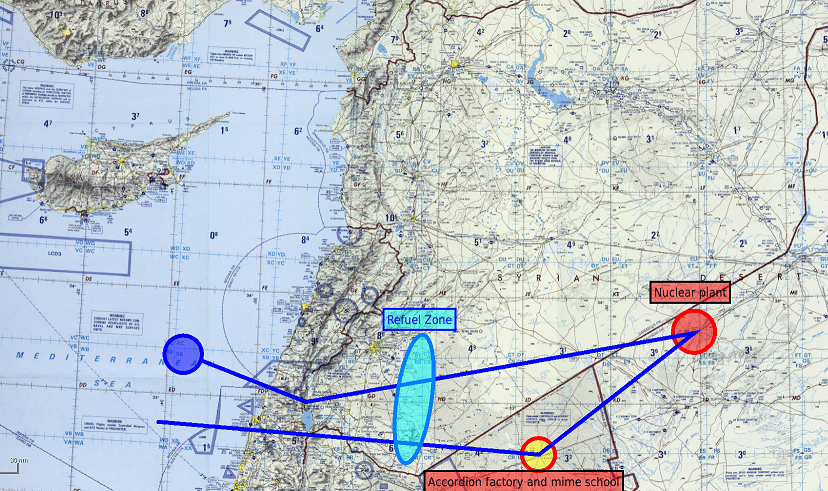 Introducing "Operation sleepy weasle", This is as far as I can make it right now the best recreation of the mission from the film "Hot shots". As there are no available Oscar EW-5894 Phallus Tactical Fighter Bombers or Folland Gnats in DCS I have used the A4-C Community mod as a substitute. This is a long range single player mission with air to air refuelling, carrier take off and landing. Fly to Iraq and bomb Saddam's nuclear plant and villa and maybe even the man himself, on the way back the secondary targets are an accordion factory and a mime school.