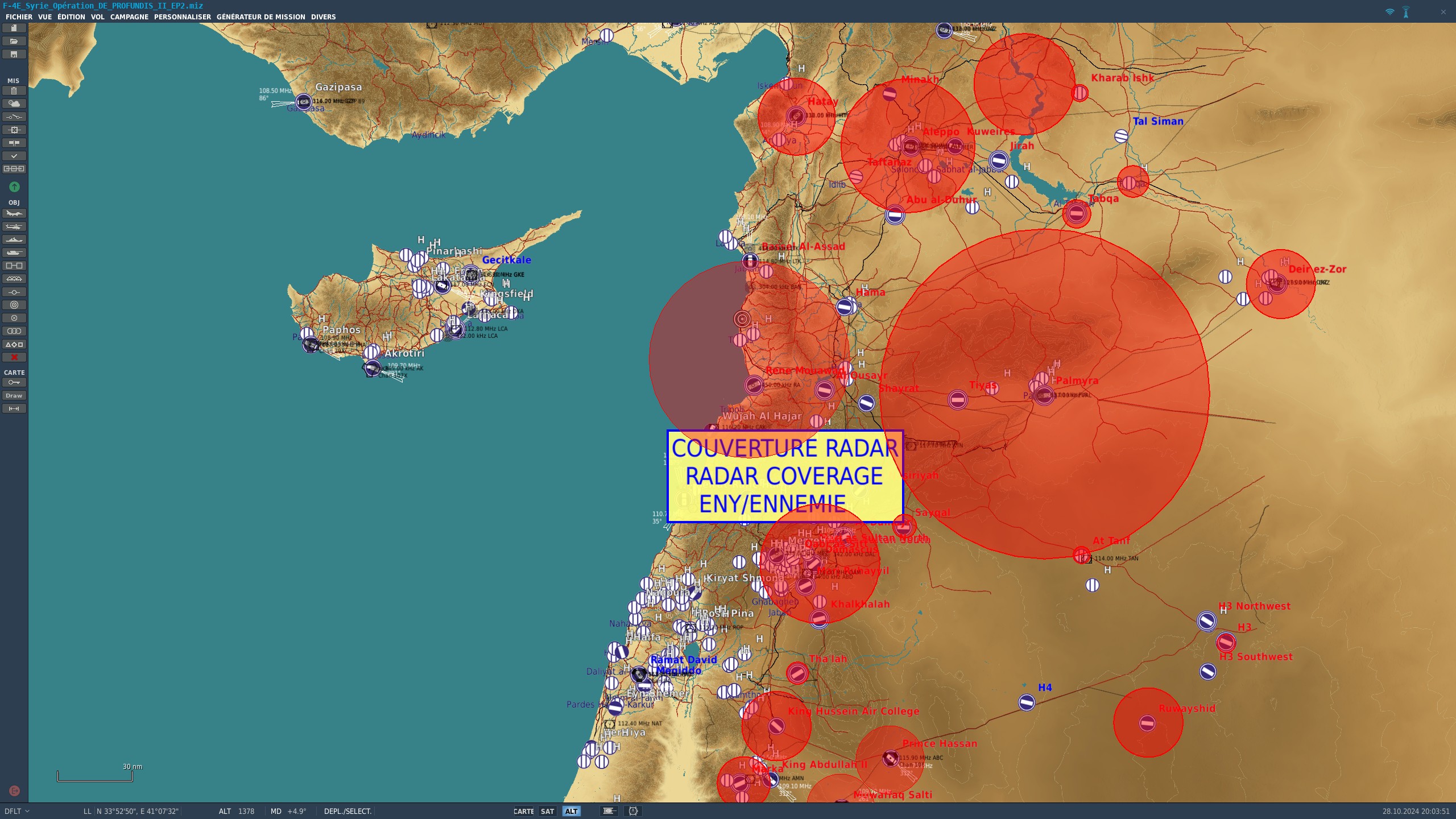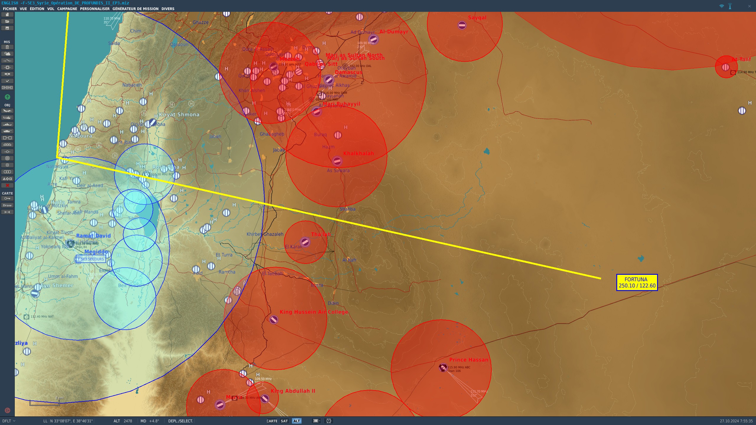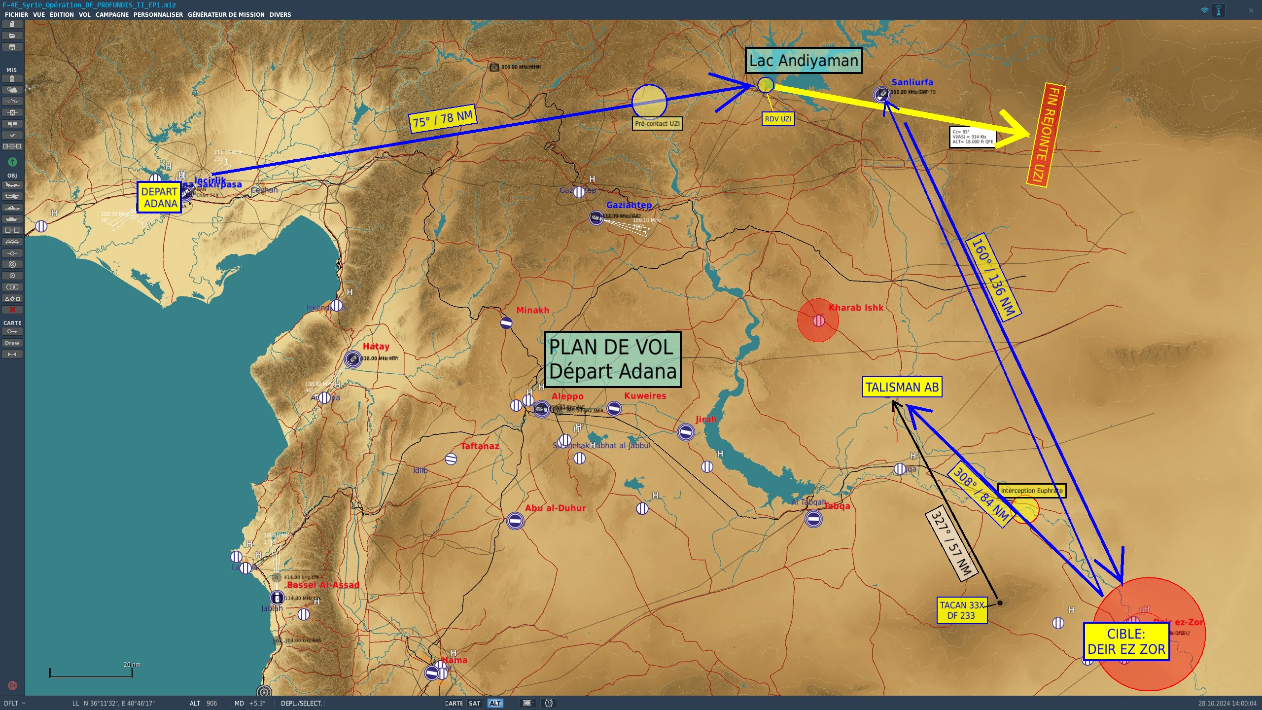 SITUATION : Nous sommes le 22 avril 2018, il est 06H25 LT. Vous venez de décoller de la piste de fortune (aménagée spécialement) de TALISMAN (voir carte). Hier, vous avez neutralisé la patrouille de 2xMiG-29A en alerte sur Deir ez Zor. Selon un renseignement ROHUM vérifié et fiable, le N°2 de ADYAQLA, une organisation terroriste internationale, doit se rendre aujourd’hui de Haditha (Ouest Irak) vers un lieu secret, proche de l’aéroport de Sayqal (38 NM au NE de Damas). Un de nos satellites a repéré ce matin, à 2h00, un convoi suspect correspondant à la cible sur une route dans l’Est de la Syrie, en provenance d’Irak. Si l’objectif est confirmé, ce haut responsable ne doit pas atteindre la région de Sayqal. Cette opération est TOP SECRET, et est supervisée par la CIA et la DGSE, en collaboration avec la NSA et la DRM.