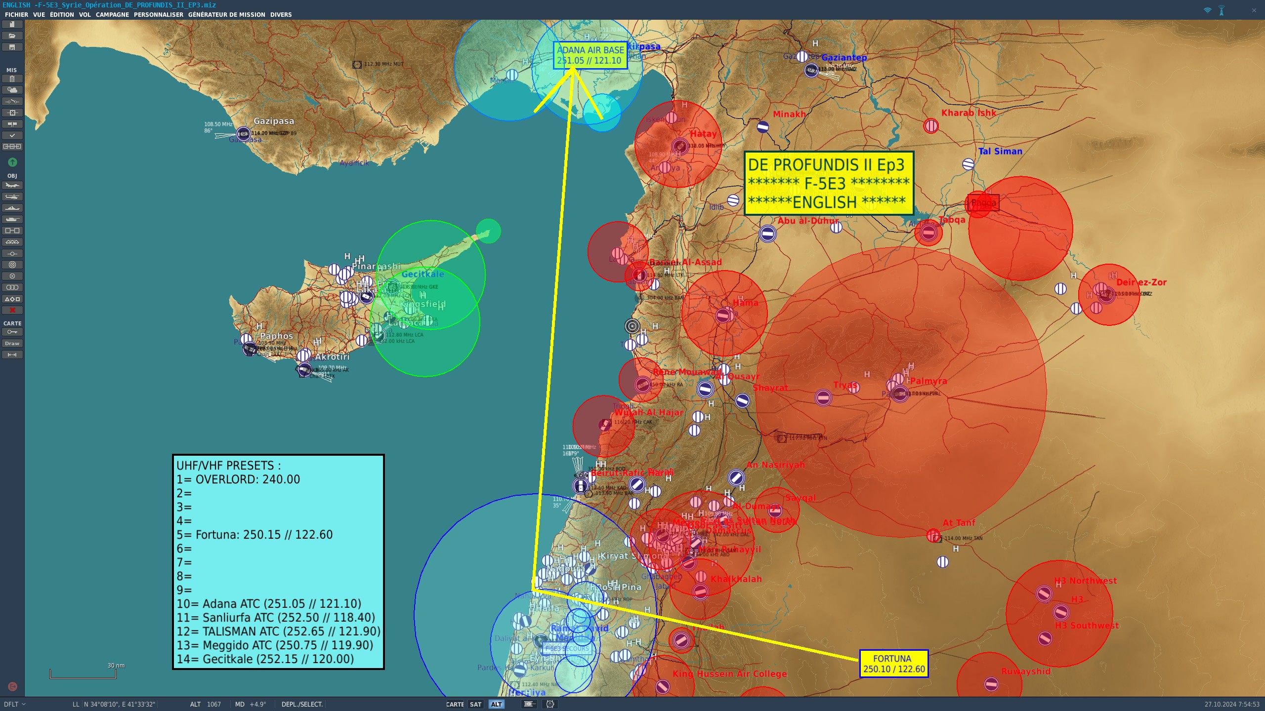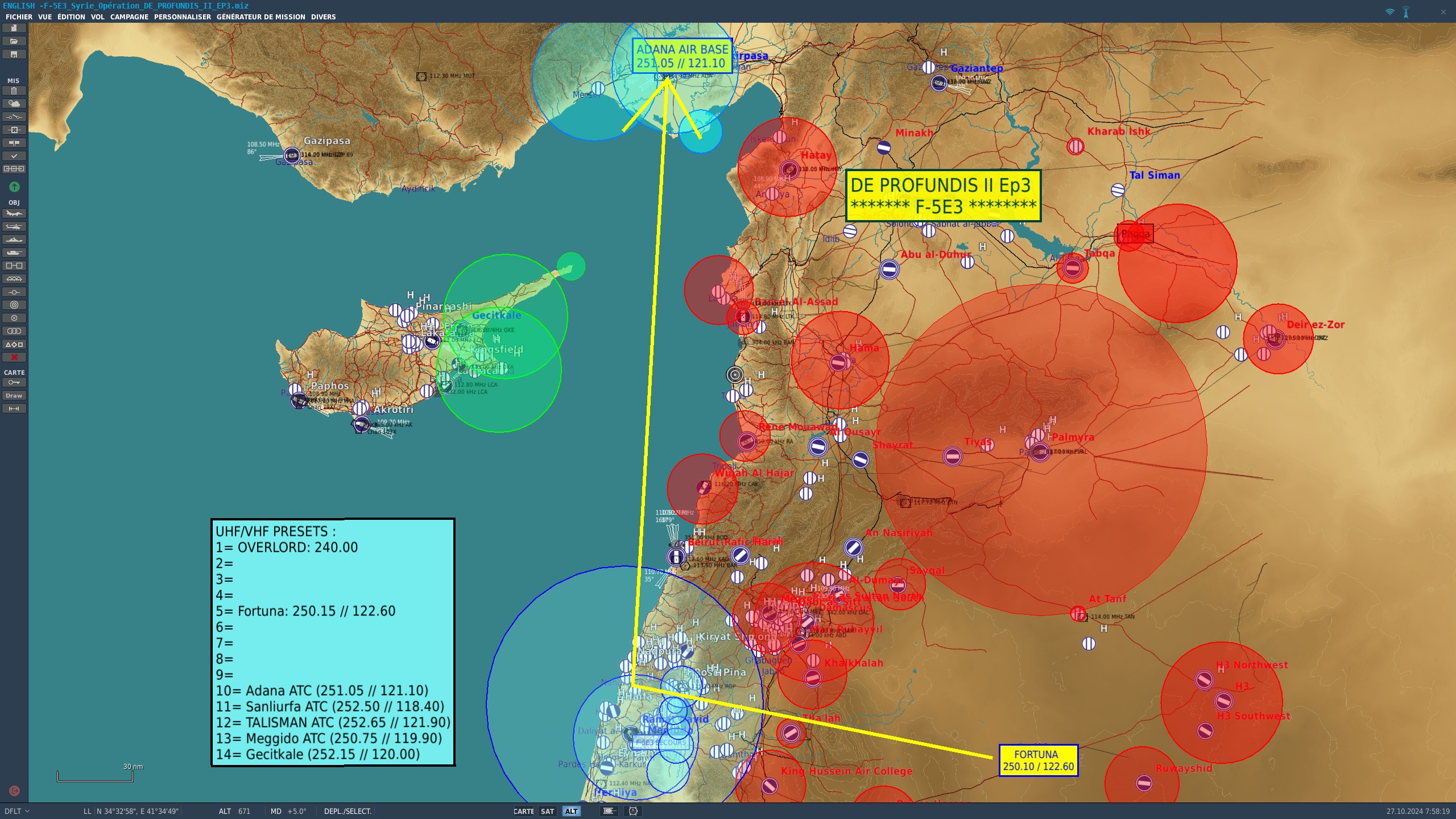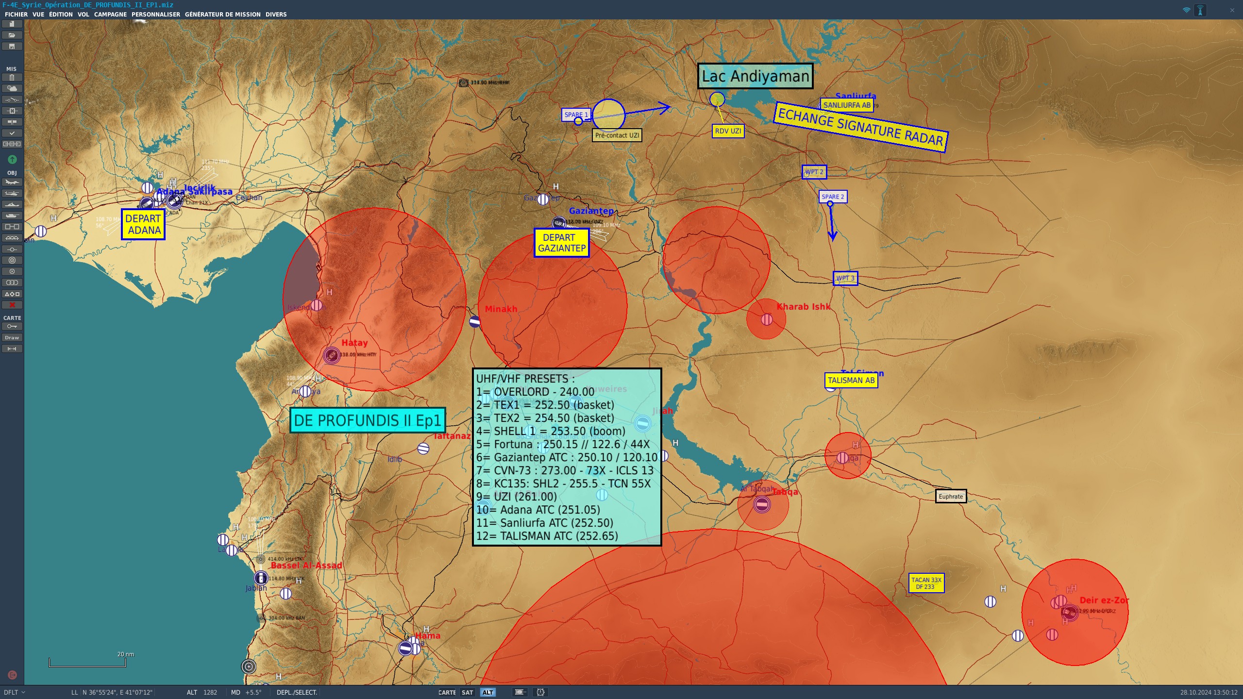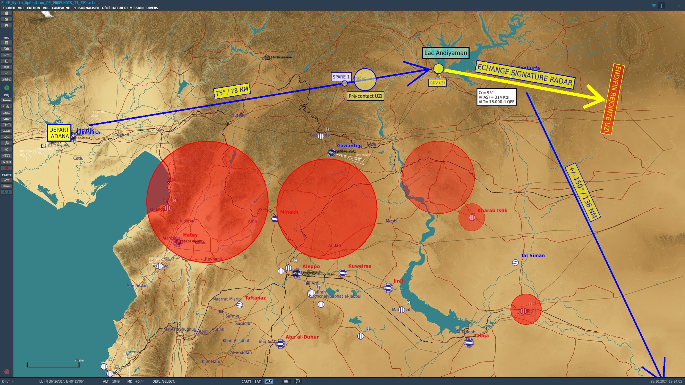 SITUATION : Nous sommes le 21 avril 2018, il est 05H10 LT. Vous êtes sur l’aéroport d’Adana (ou Gaziantep selon votre choix) chez notre allié turc. Selon un renseignement ROHUM vérifié et fiable, le N°2 de ADYAQLA, une organisation terroriste internationale, doit se rendre aujourd’hui de Haditha (Ouest Irak) vers un lieu secret, proche de l’aéroport de Sayqal (38 NM au NE de Damas). Un de nos satellites a repéré ce matin, à 2h00, un convoi suspect correspondant à la cible sur une route dans l’Est de la Syrie, en provenance d’Irak. Si l’objectif est confirmé, ce haut responsable de ADYAQLA ne doit pas atteindre la région de Sayqal. Une mission STRIKE (Ep2) est programmée pour le neutraliser. Vous neutraliserez une patrouille d'alerte de 2xMiG29A sur la base de Deir ez Zor afin d'ouvrir la voie à la mission principale.