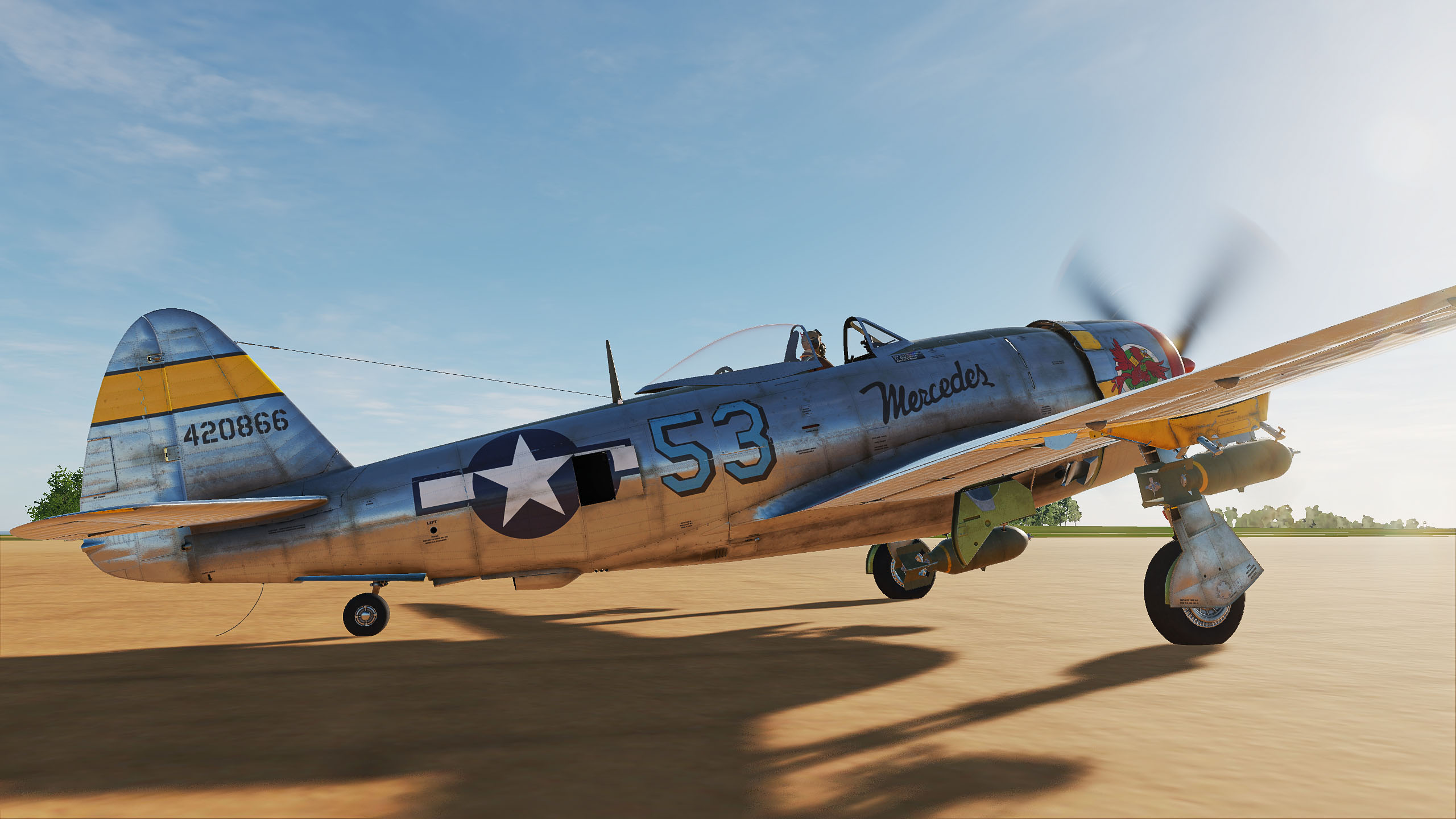 As Hallett himself said of the Thunderbolt (after only 45 minutes in it), "When you pulled back the stick in a P-38 the plane would go up whereas the P-47 had a much higher wing-load... I pulled back on the stick and the attitude changed but the altitude did not!". As he passed over the guys on the bridge he managed to crash the brand-new unit inbetween two trees. Hence the bare aluminium wings, fitted as a replacement for the ones he'd irrepairably damaged!