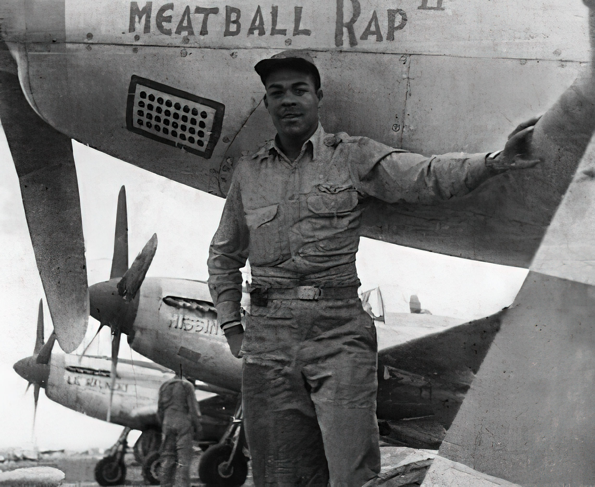 P-51D Mustang 'Meatball Rap II' of 1st. Lt. (F/O) Charles Lane, 99th FS 332nd FG 'Red Tails'. Ramitelli, Italy March 1945. Note the late war 99th FS nose band marking on this machine is light blue instead of the earlier dark blue and white diamond pattern. Of course, given the name I had no choice but to make this one!