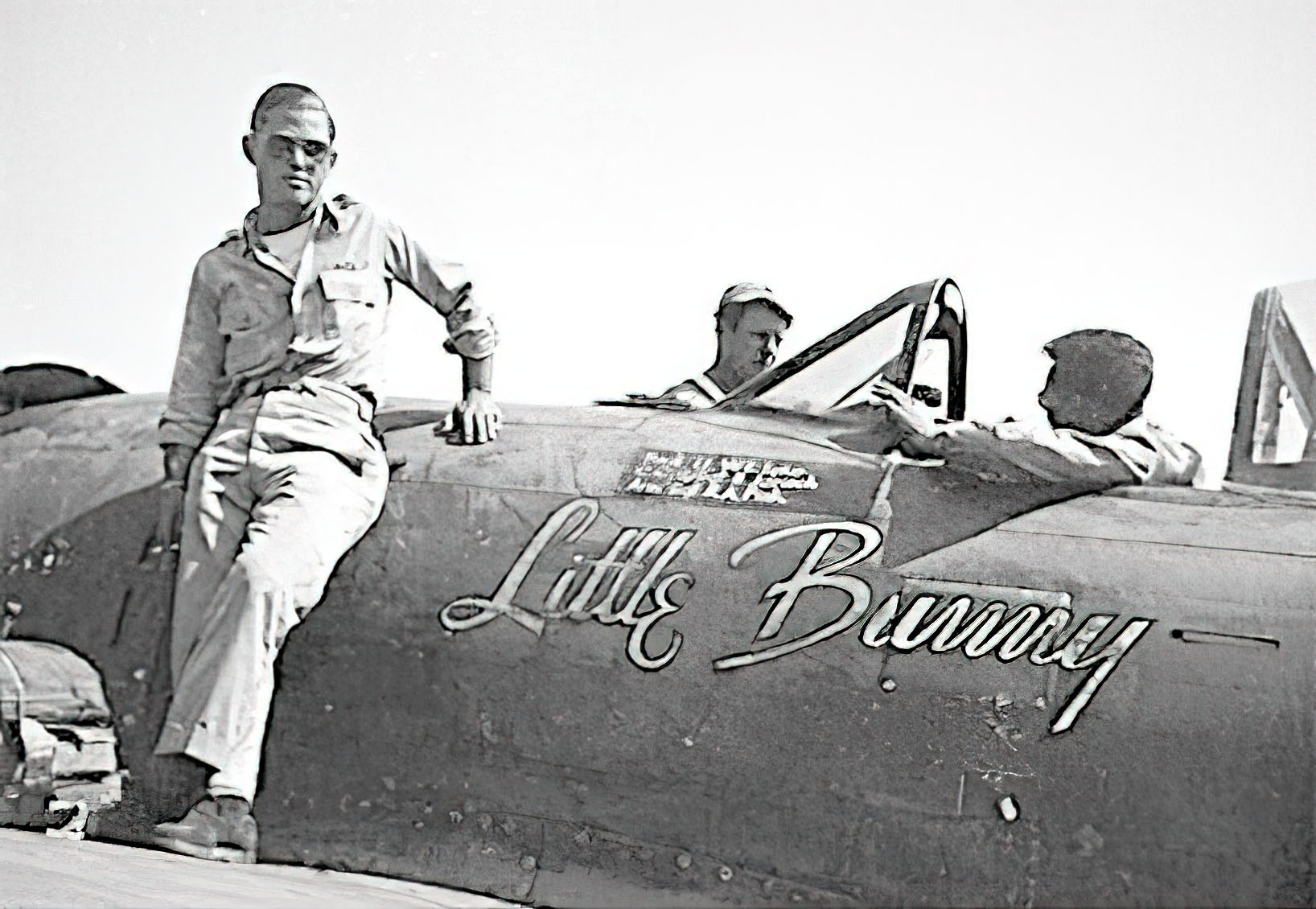 Piloted by Lt. F. J. Middleton (pictured standing on the wing root of 'Little Bunny'), the crew chief was S/Sgt. L. Walker and the armourer was Cpl. S. Bauer.