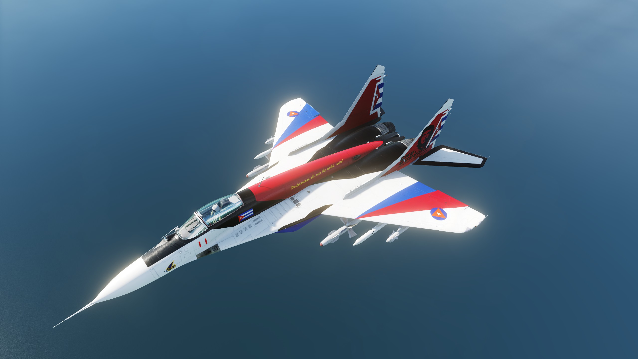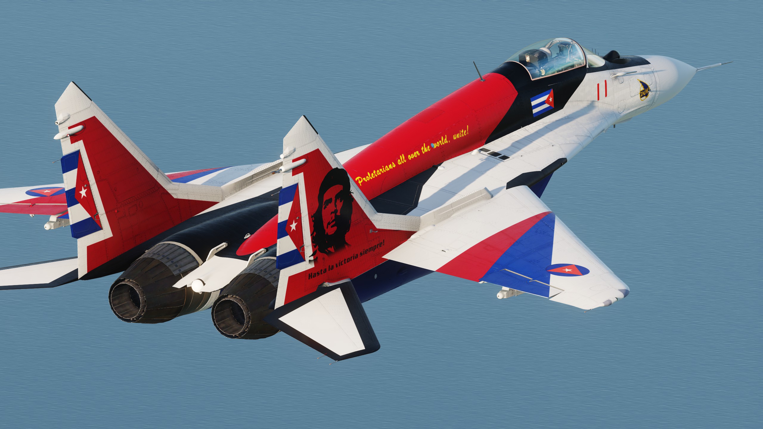 After watching a video about Che Guevara, I was deeply moved. After searching some articles, I found that the Cuban Air Force has also equipped a certain number of Mig-29, but now only one can fly. So, I made this livery to express my deep respect to Comrade Che Guevara. Interestingly, in the DCS, the most commonly used tactic of Mig-29 is also the guerrilla movement between mountains and forests. I do hope that you will like this. Thank you!
