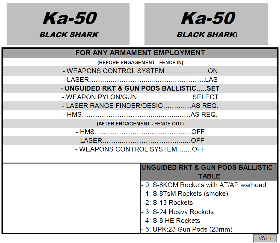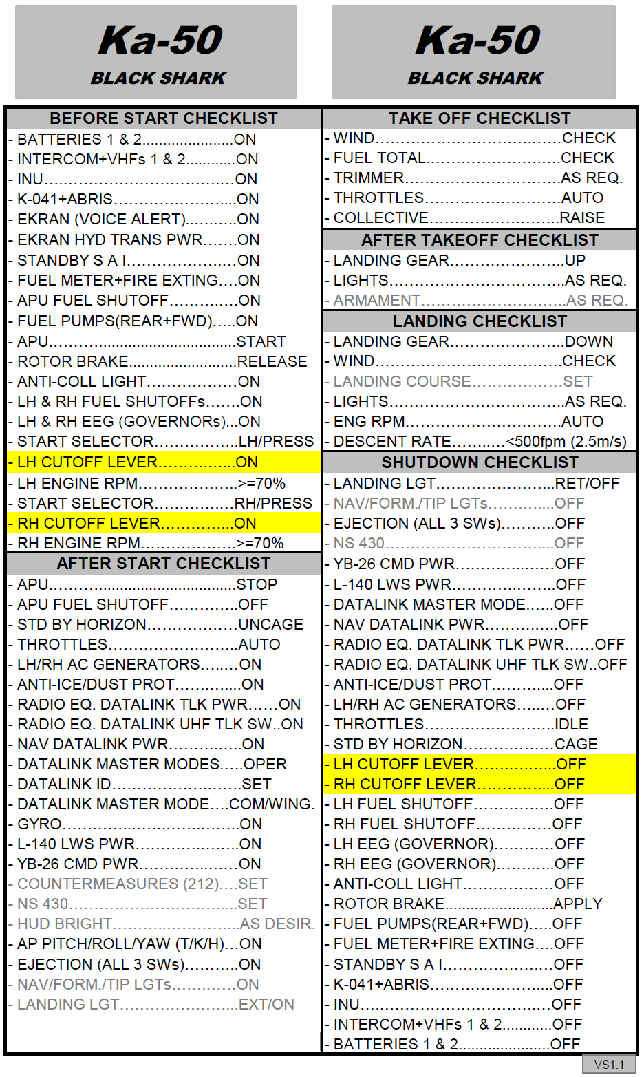 This is a checklist far from the real one, but that will get you flying quick and safely. This is the version of the Ka-50 checklists.