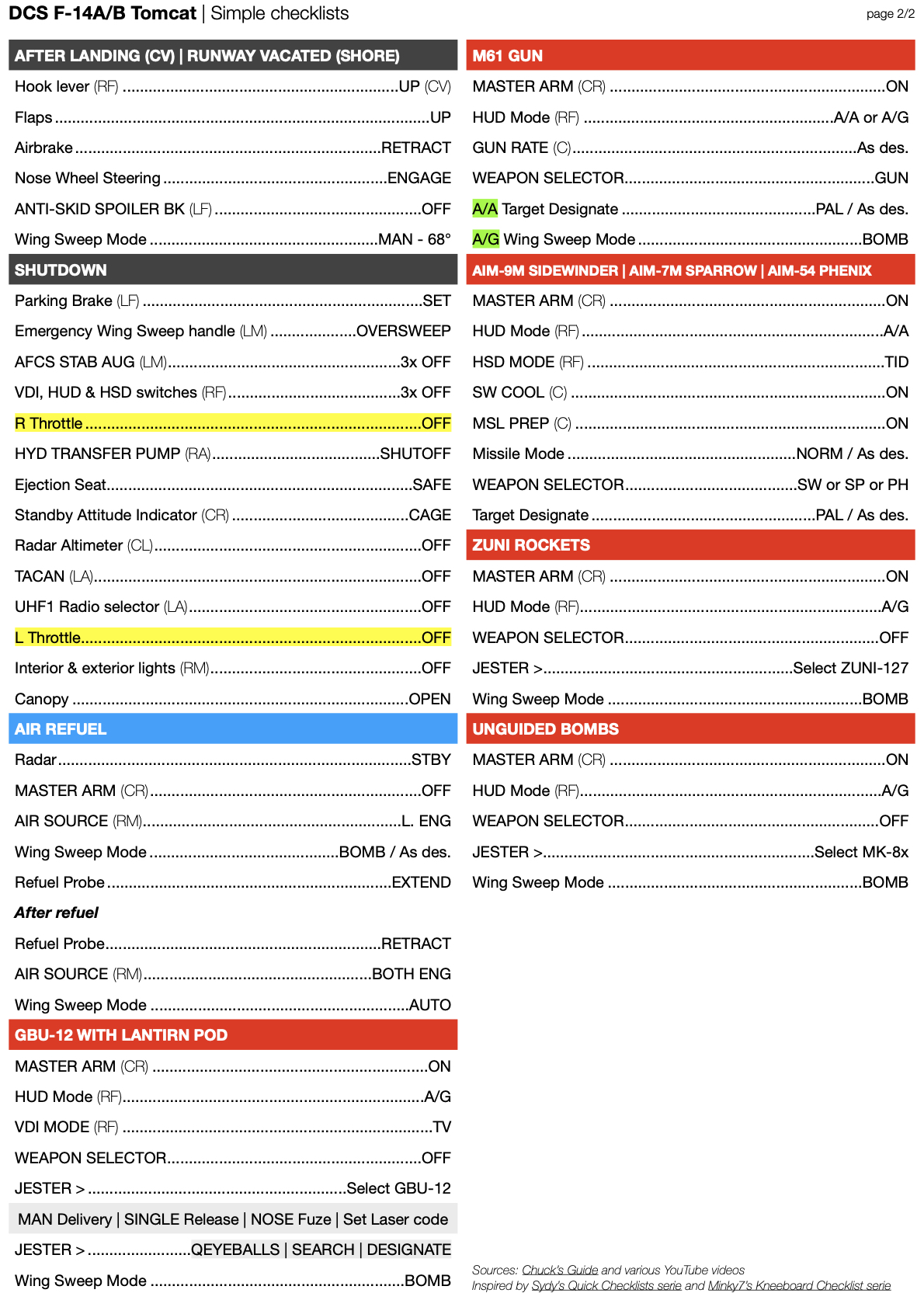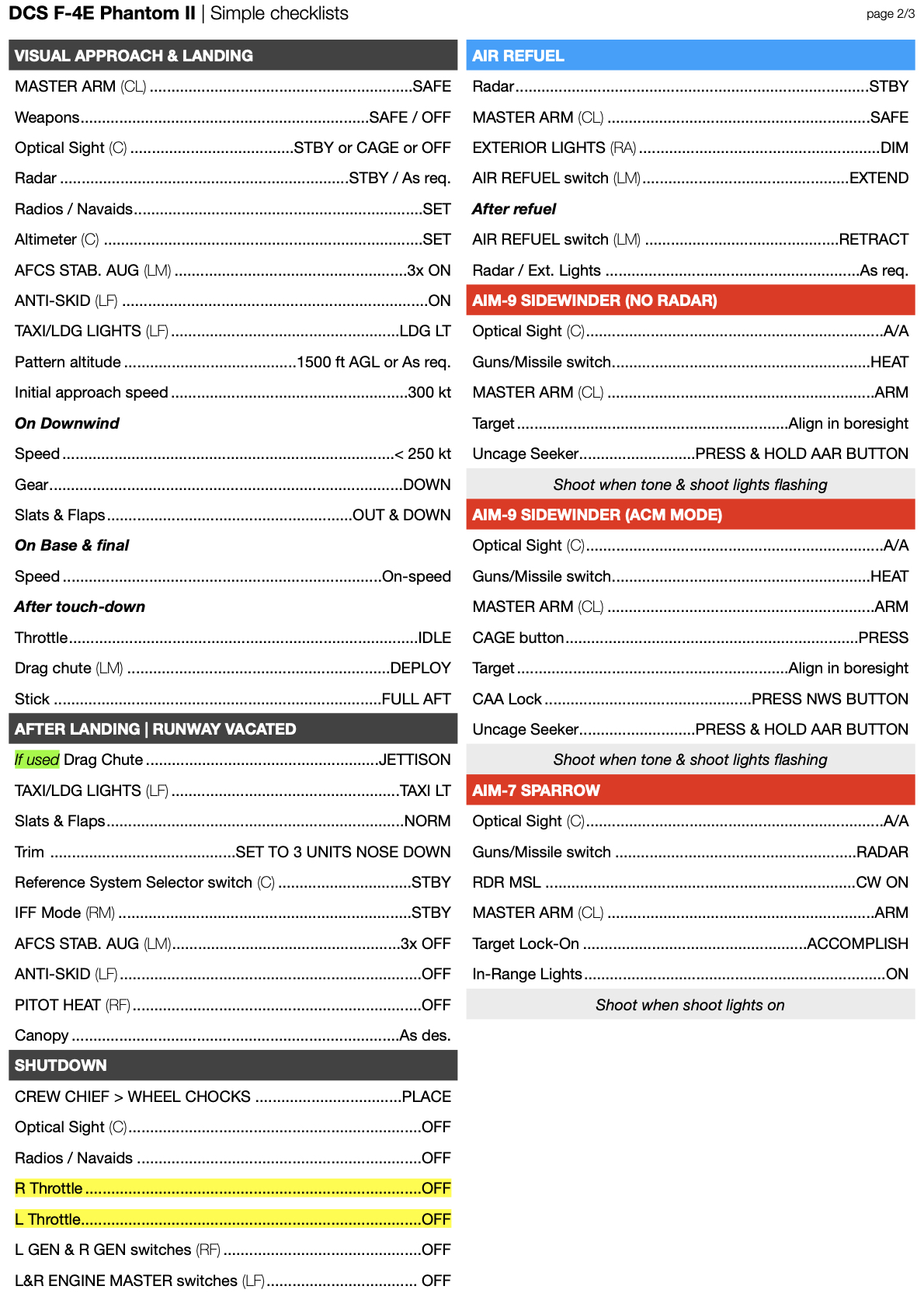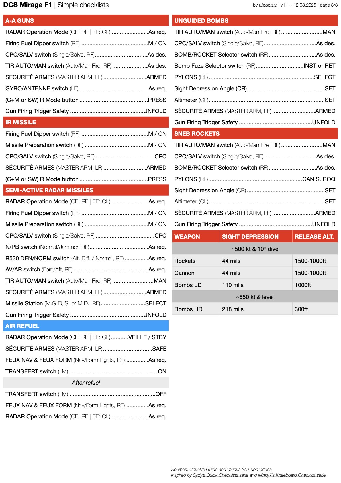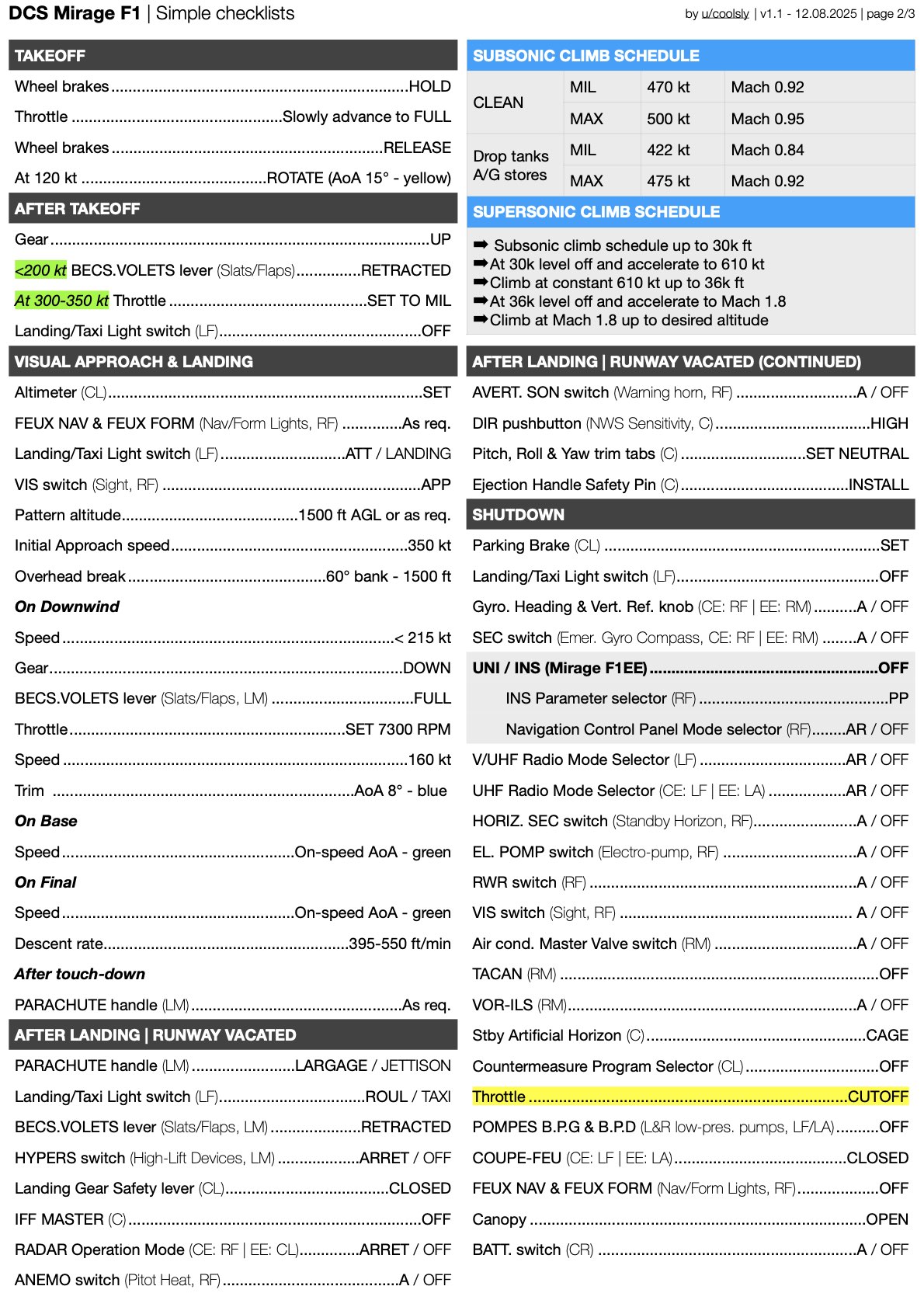 A simple yet detailed enough kneeboard checklist for the Mirage F1 (all variants) with procedures for startup, take-off, landing and basic weapons usage.