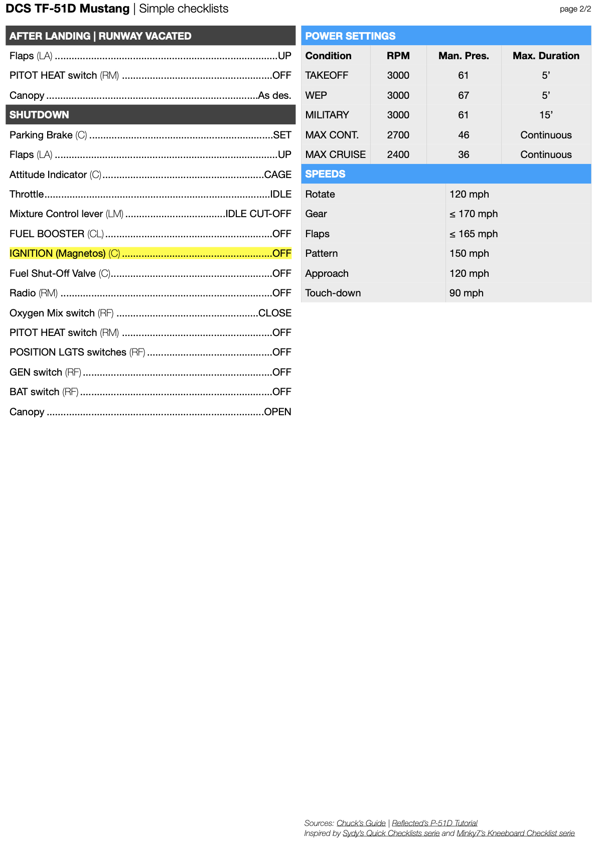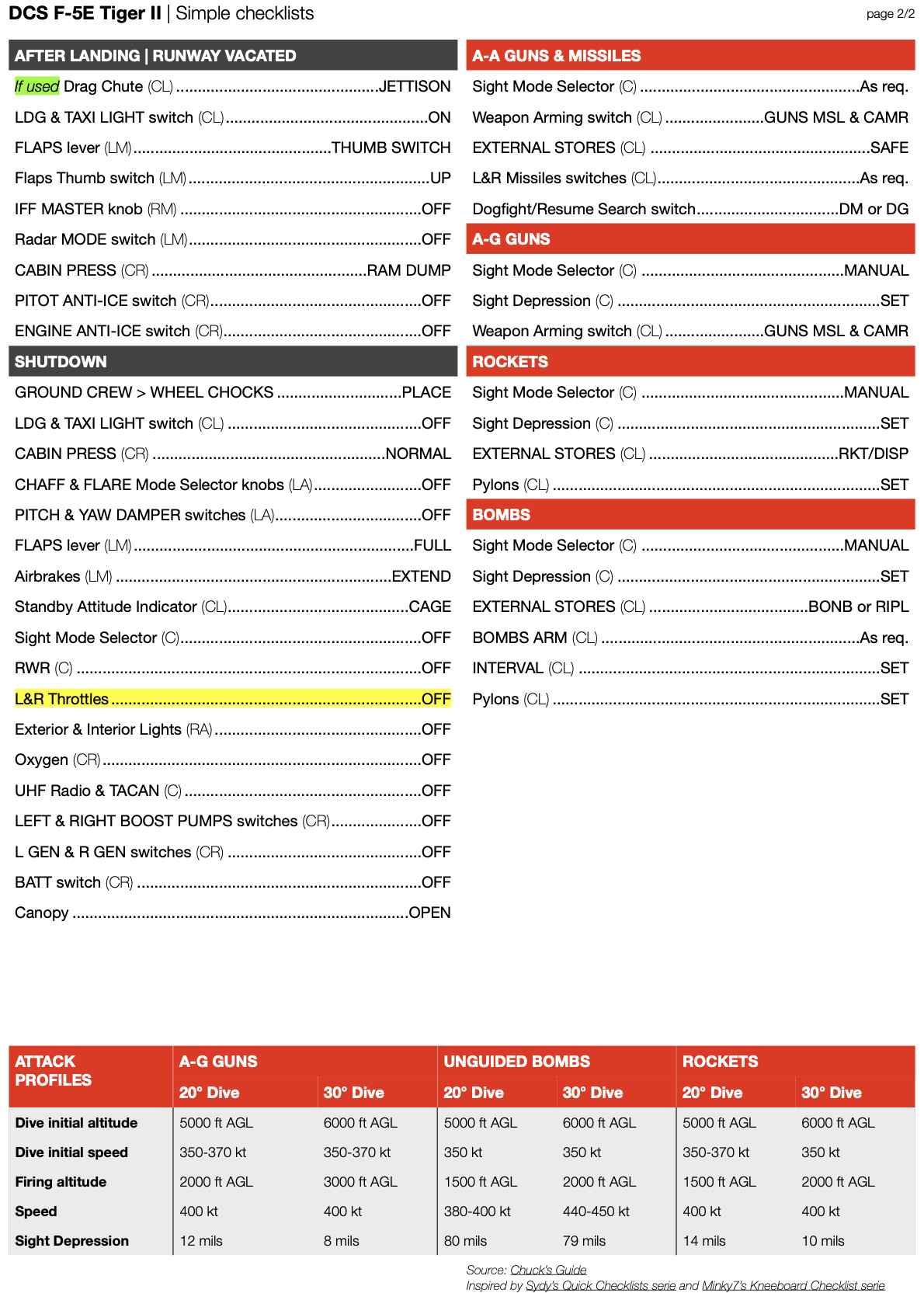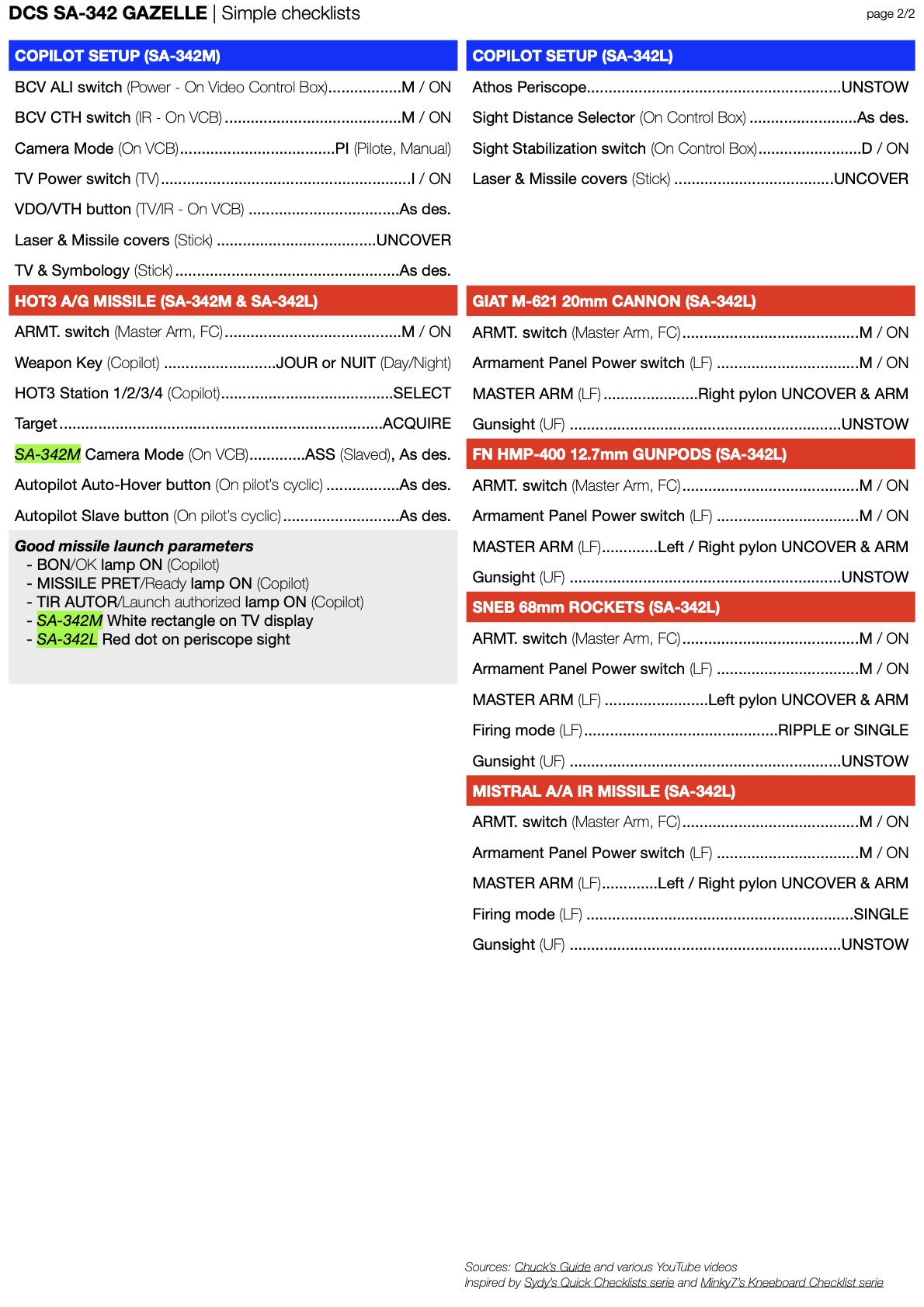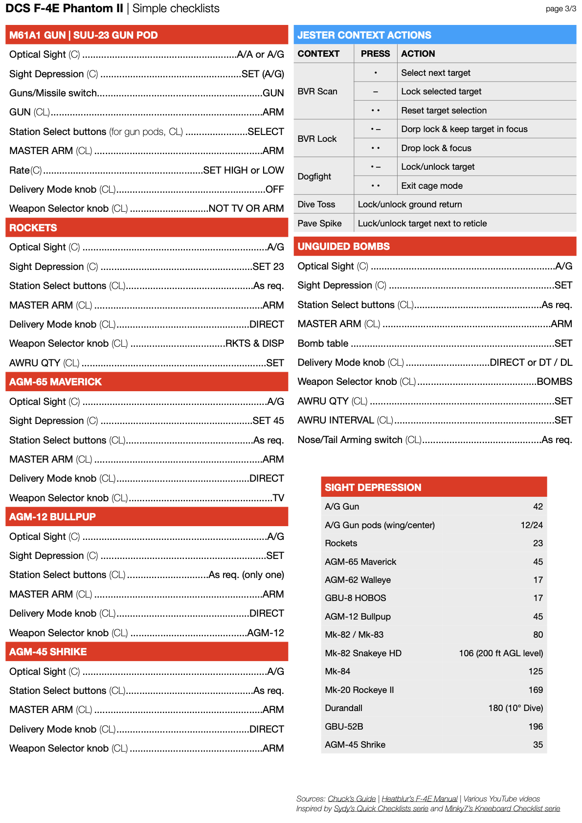 A simple yet detailed enough kneeboard checklist for the Mirage F1 (all variants) with procedures for startup, take-off, landing and basic weapons usage.