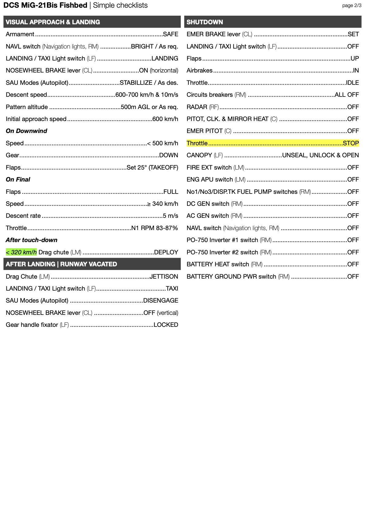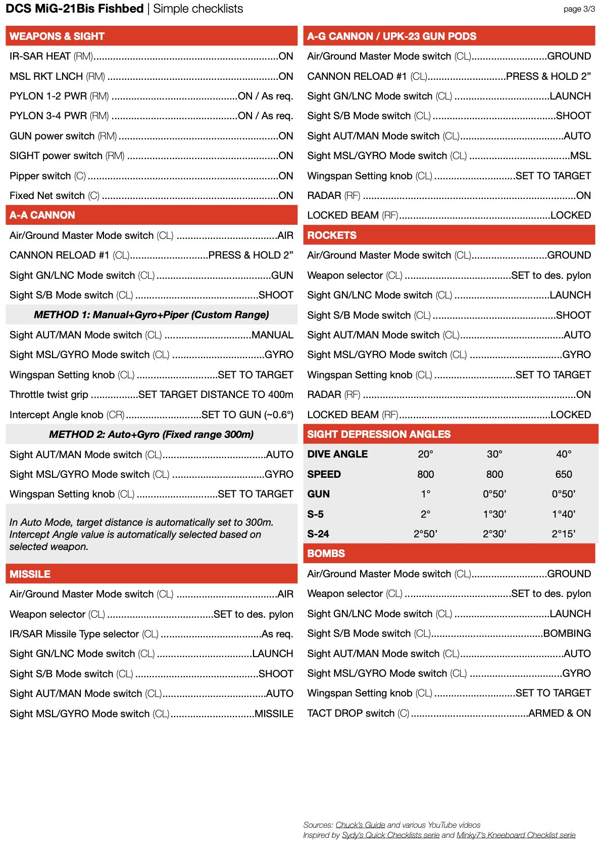 A simple yet detailed enough kneeboard checklist for the MiG-21Bis Fishbed (English cockpit) with procedures for startup, take-off, landing and basic weapons usage.