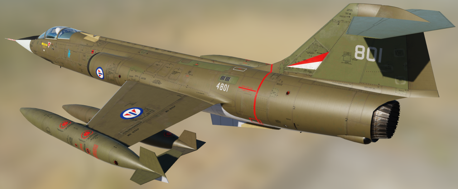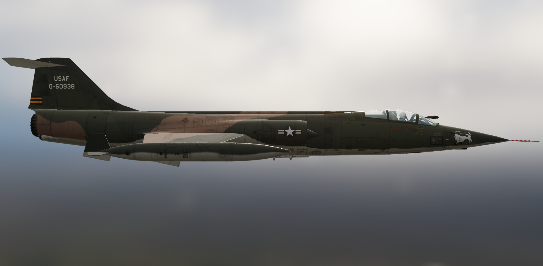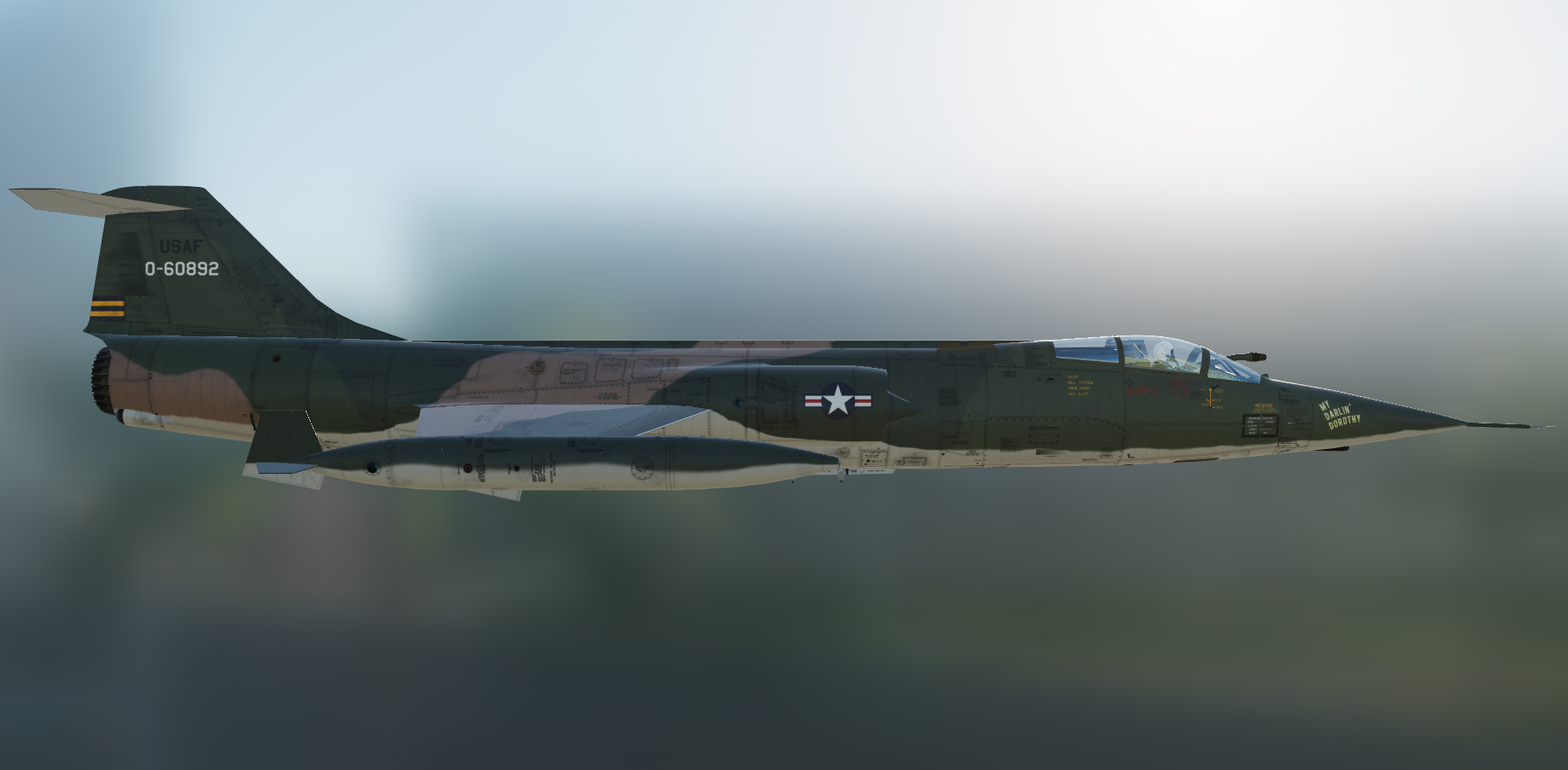 A layered paint kit for the VSN F-104G model. Contains layer groups for examples of both USAF natural metal finish and markings, and Southeast Asia camo. Includes Roughmets, example normal maps and pilot textures.