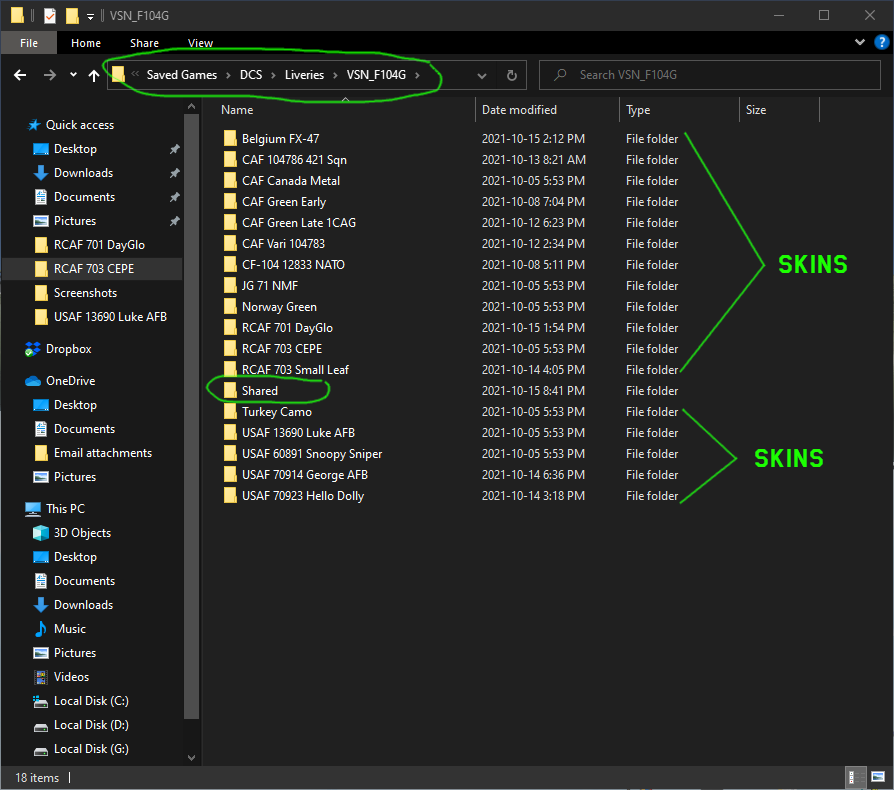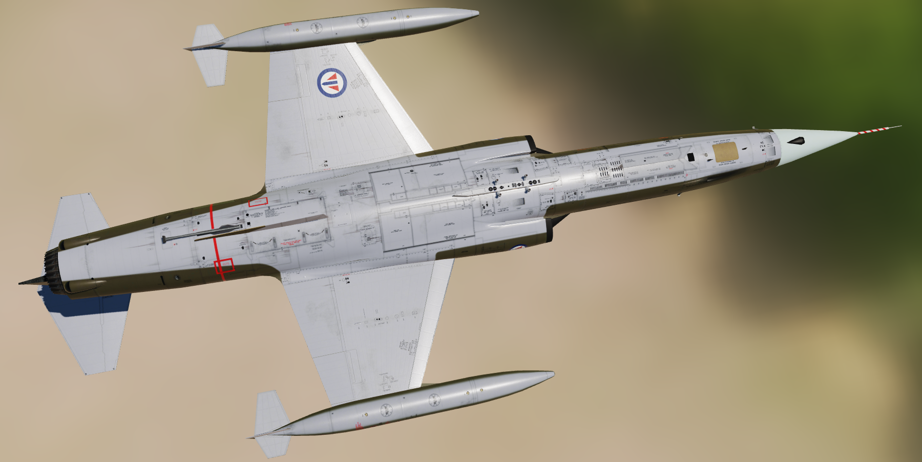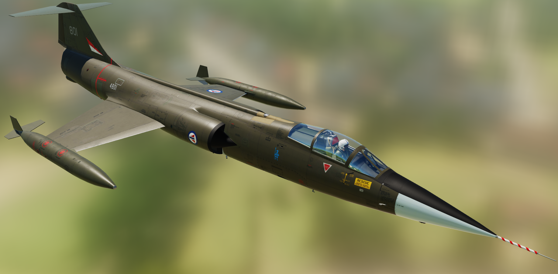 A layered paint kit for the VSN F-104G model. Contains layer groups for examples of both USAF natural metal finish and markings, and Southeast Asia camo. Includes Roughmets, example normal maps and pilot textures.
