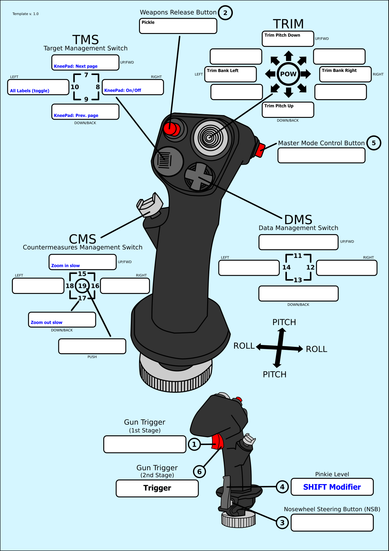 Some years ago I made these SVG templates, that I have used to generate kneeboard pages for the HOTAS setup for my various modules. These SVG files have been made with InkScape, and they are multi-layered, so the various layers can be locked/unlocked and made visible/invisible. There is templates for Thrustmaster Warthog -Throttle, -Joystick and MFDs.