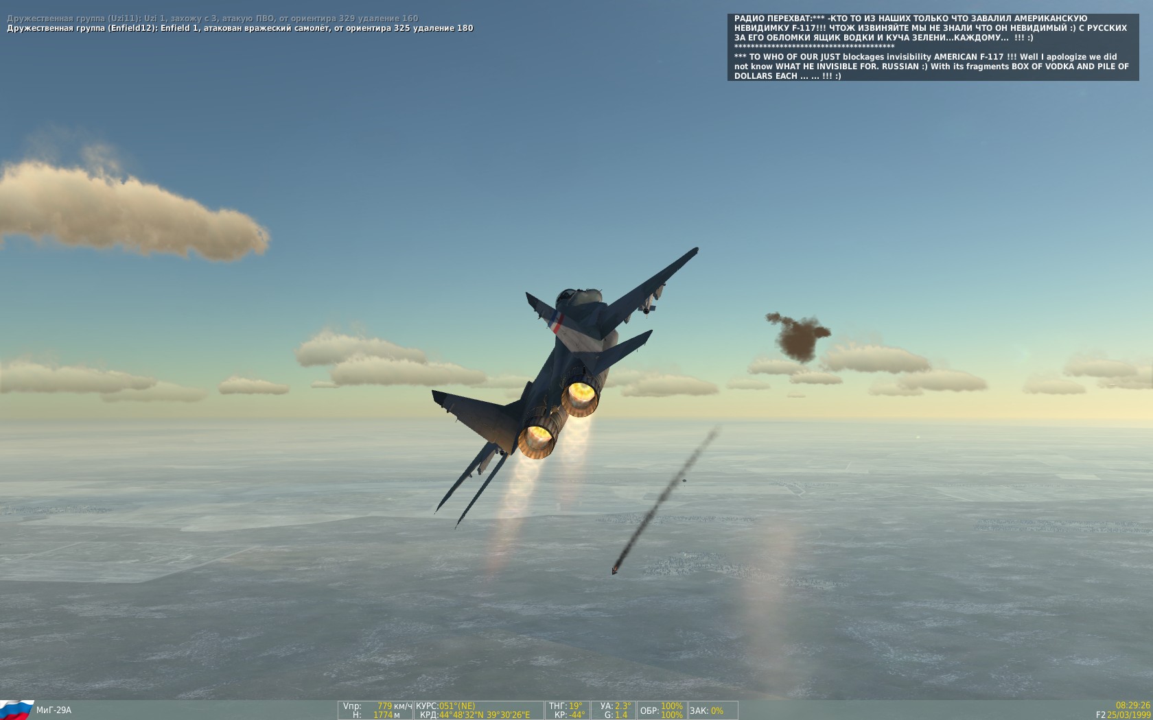 25 МАРТА 1999 ГОДА. АВИАЦИЯ NATO БЕЗ САНКЦИИ ООН -НАЧАЛА ВАРВАРСКИЕ БОМБАРДИРОВКИ СУВЕРЕННОЙ ЮГОСЛАВИИ. -В СОСТАВЕ 127й ЭСКАДРИЛИИ 204го ИСТРЕБИТЕЛЬНОГО АВИА ПОЛКА ПОД КОМАНДОВАНИЕМ ПОЛКОВНИКА МИЛЕНКО ПАВЛОВИЧА -ВАМ ПРЕДСТОИТ КОМАНДИРОМ ПАРЫ ИСТРЕБИТЕЛЕЙ МИГ-29А  ЮГОСЛАВСКИХ ВВС УЧАСТВОВАТЬ В ИСТОРИЧЕСКОЙ РЕКОНСТРУКЦИИ ТЕХ ТРАГИЧЕСКИХ СОБЫТИЙ В ВАРИАЦИИ -А ЕСЛИ БЫ РОССИЯ ПРИШЛА НА ПОМОЩЬ... (подвески и тактические построения максимально реалистичны из возможного.) ДОСТУПНО УПРАВЛЕНИЕ НАЗЕМНОЙ ТЕХНИКОЙ... ПЕРЕД ИГРОЙ УСТАНОВИТЬ СЕБЕ НА МИГ-29А СКИН ВВС ЮГОСЛАВИИ. (В БОЮ БЕРЕГИТЕ СВОЙ САМОЛЁТ)