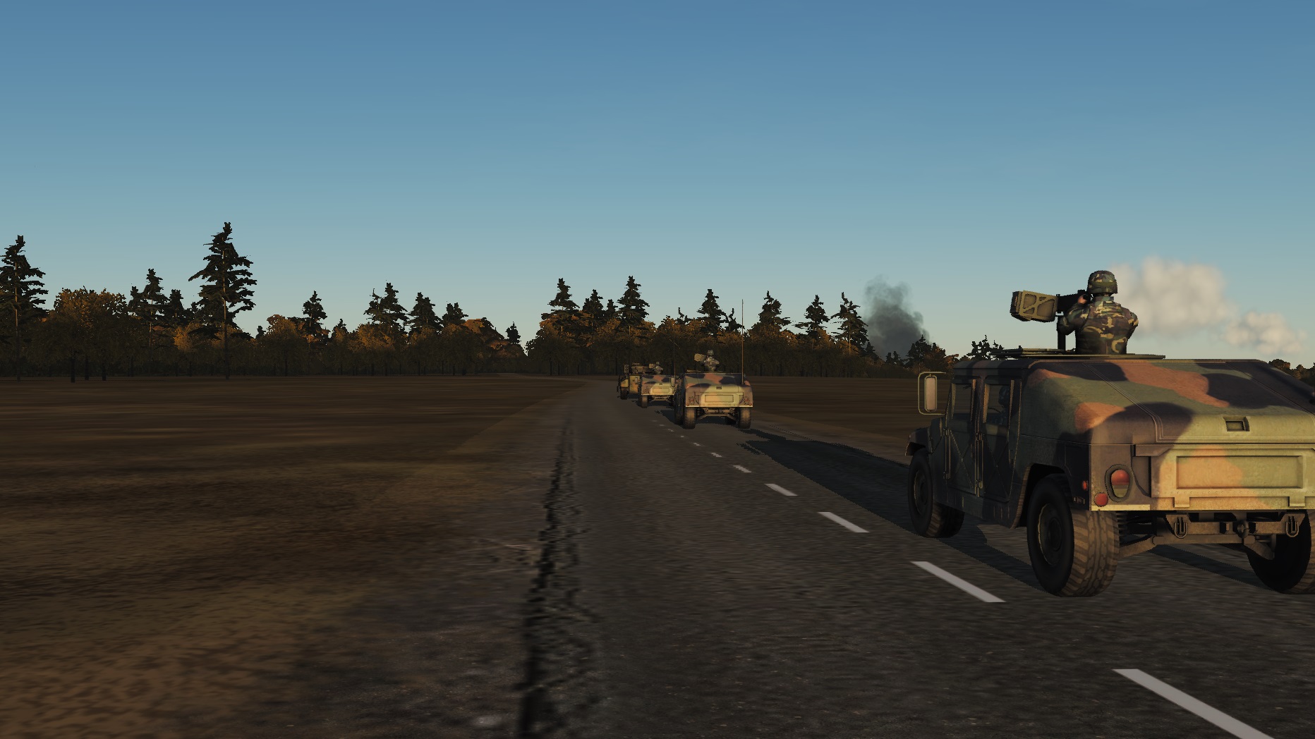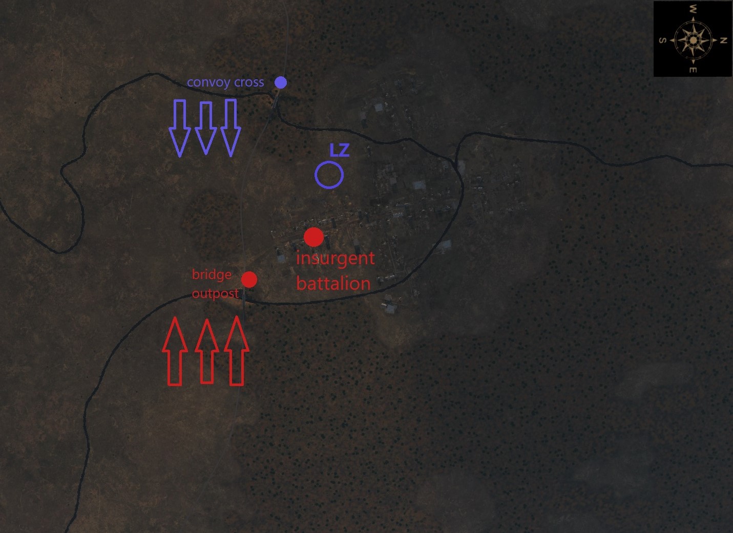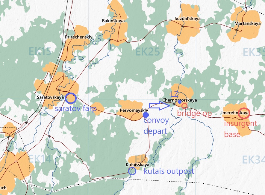 We'll have a convoy consisting of two elements, Baby Bear 1 and Baby Bear 2. They'll cross the western bridge with air support from Colt, and establish a position in the center of town for an LZ. They'll have overwatch from our AH-1 Cobra flight once the LZ is cleared. Baby Bear 1 will provide landing clearance for Colt and Pontiac to ins ert our ODA raiders, and then the lead element will push east towards the road to Imeretin to defend against any counterattacks.