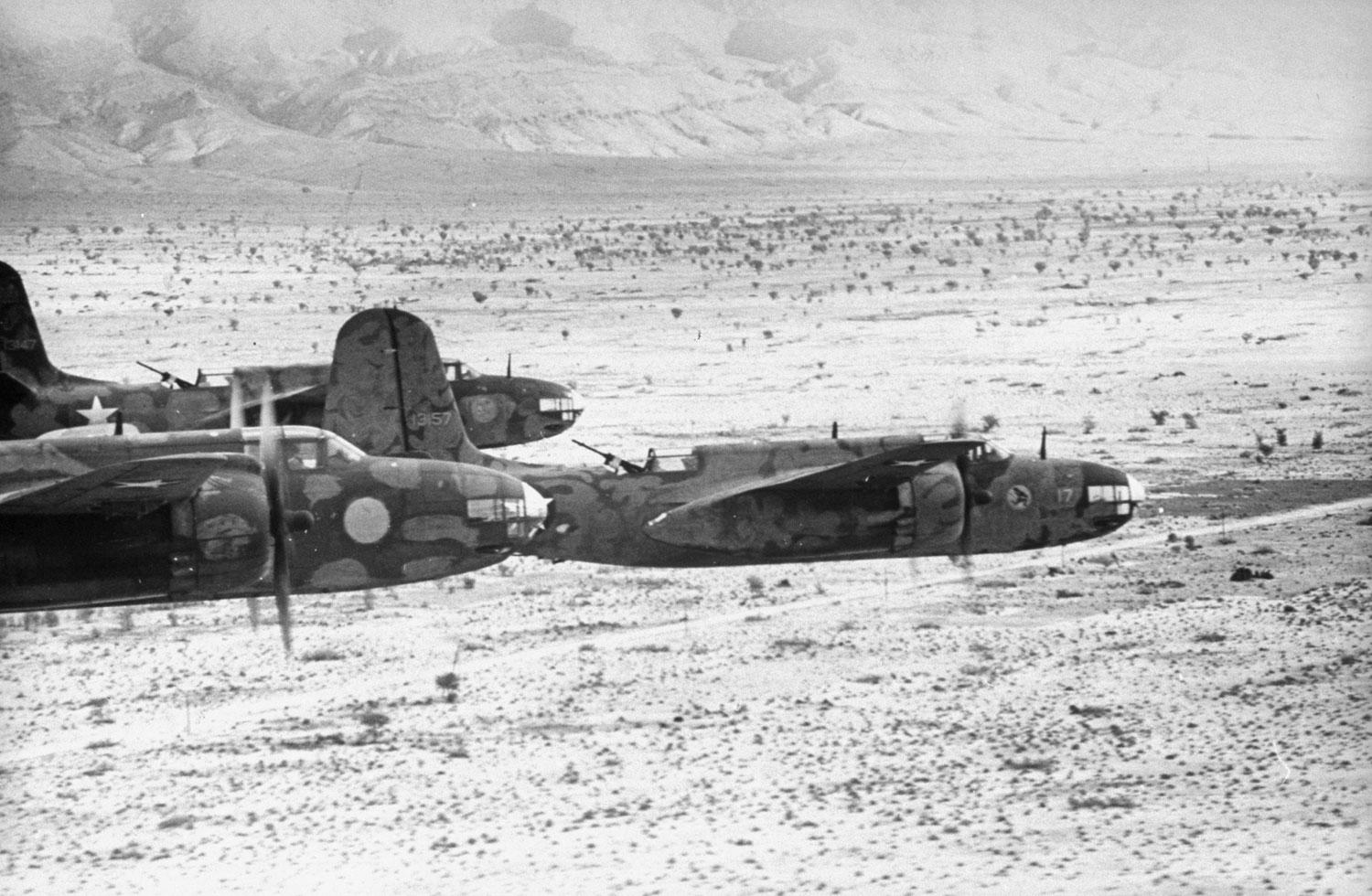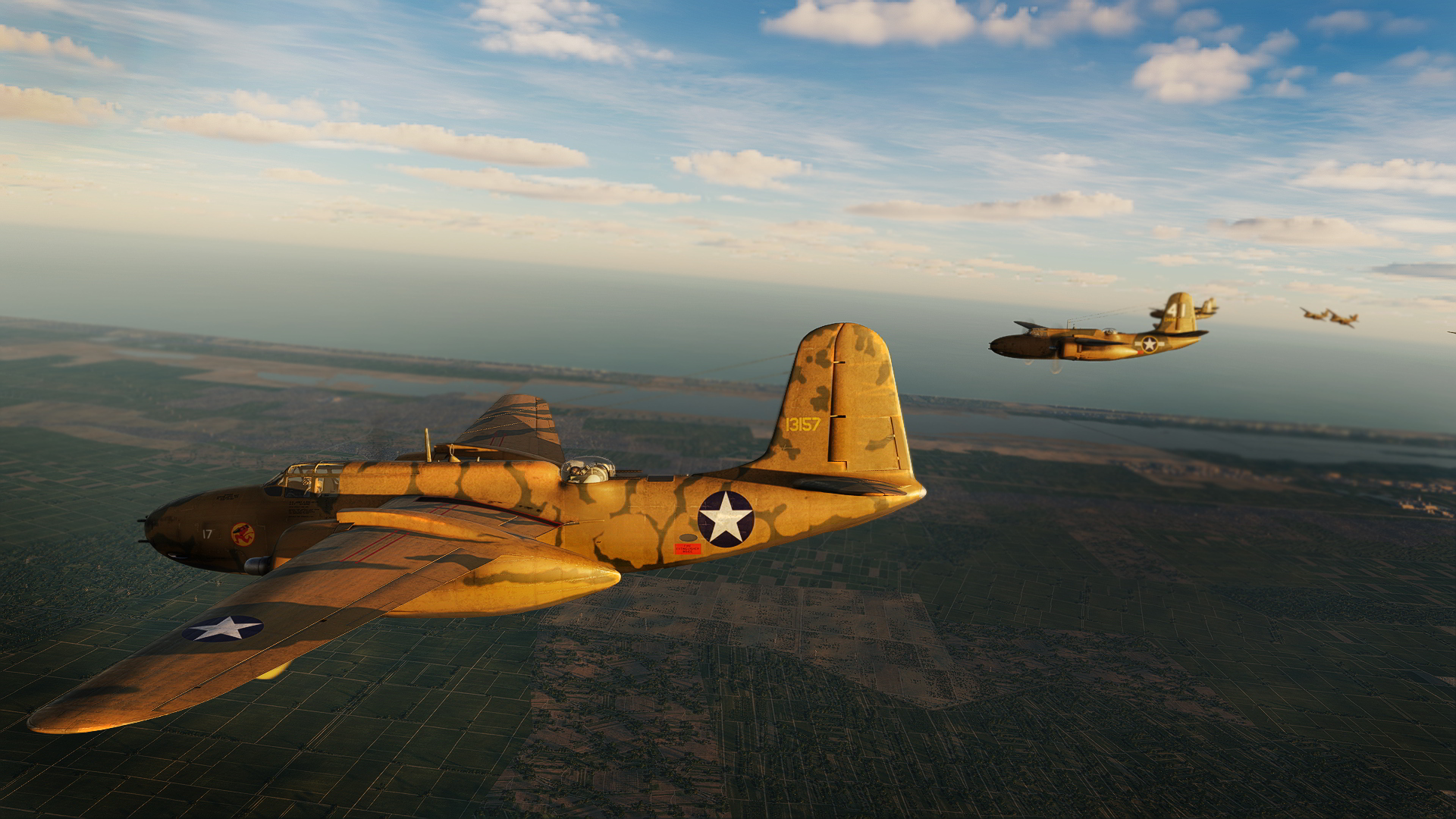 This livery depicts a Douglas A-20B-DL, SerNo. 41-3157, Code No. 17 of the 84th BS, 47th BG, 12th AF based at Youks-les-Bains airfield, Algeria, 6 January 1943. (In the attached photograph, 41-3157 is the leading aircraft.