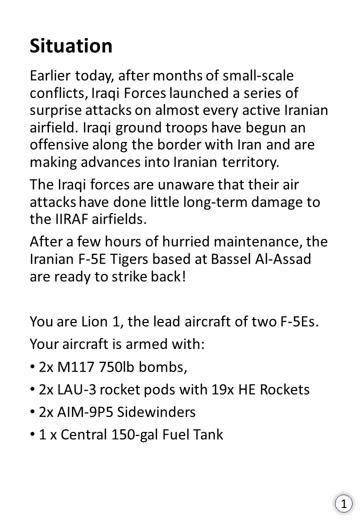 The Iraqi forces are unaware that their air attacks have done little long-term damage to the IIRAF airfields. After a few hours of hurried maintenance, the Iranian F-5E Tigers are ready to strike back!
