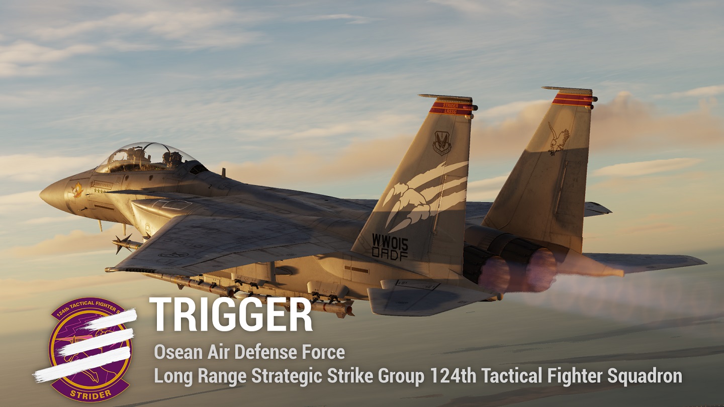 Trigger is a male Osean Air Defense Force pilot, a member of the Long Range Strategic Strike Group and former member of Mage Squadron. Following his alleged murder of former Osean President Vincent Harling, he was reassigned to an Osean Air Force penal unit, Spare Squadron. He later became the leader of Strider Squadron in the LRSSG.