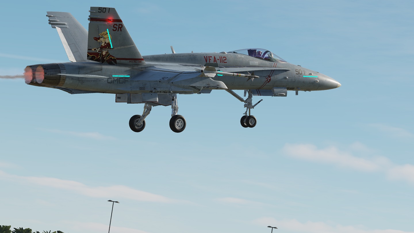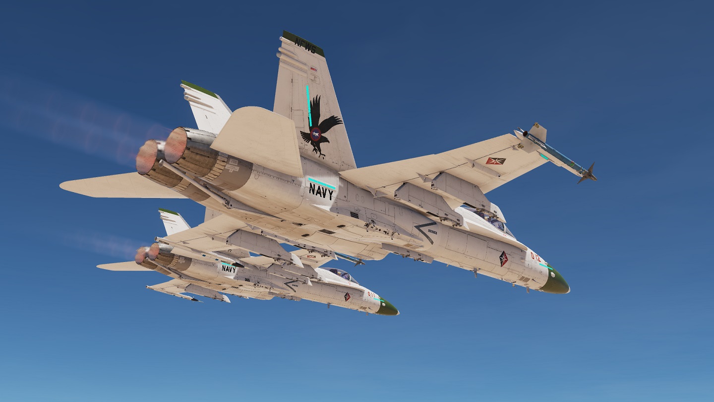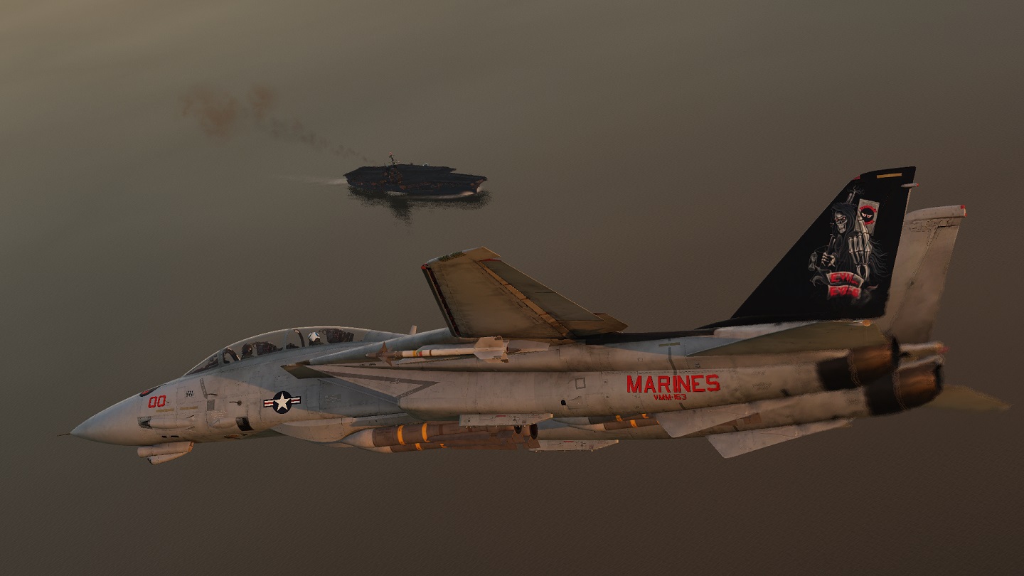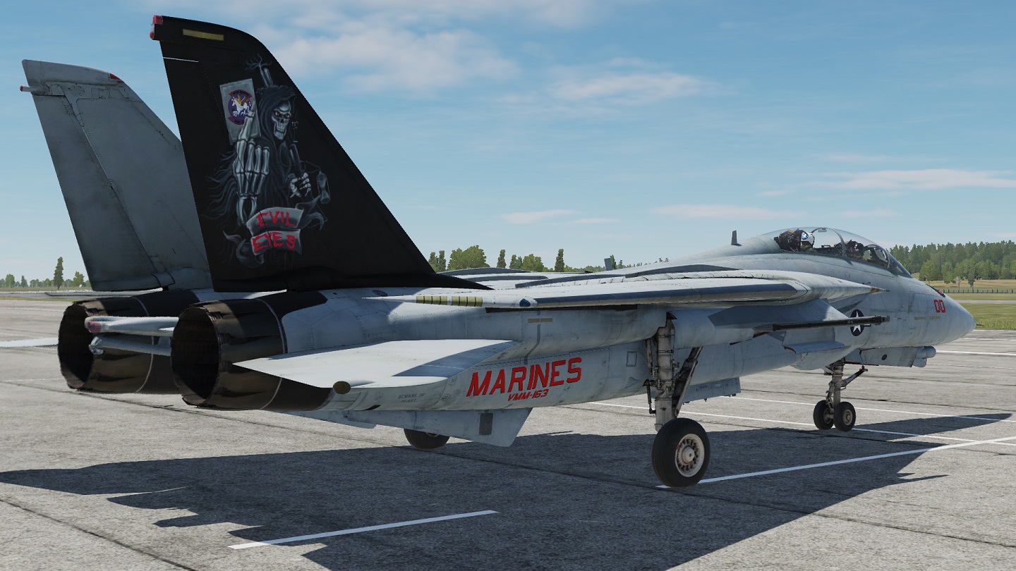 When the squadron is “chopped” to a Marine Expeditionary Unit as the core of the Air Combat Element, additional aircraft squadrons are also attached under the VMM-163 (REIN) designation and don the eponymous eyes on their own aircraft. This skin was two "What If scenarios", first being a Marine Corps Fighter Attack Squadron was attached to the Evil Eyes and wore a legacy VMM-163 flagship livery, and second, if the Marines had adopted the F-14 instead of the Hornet.