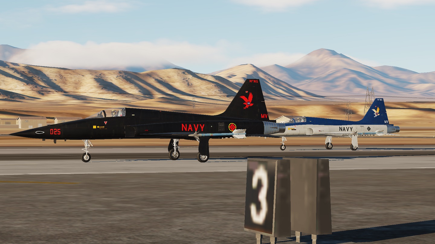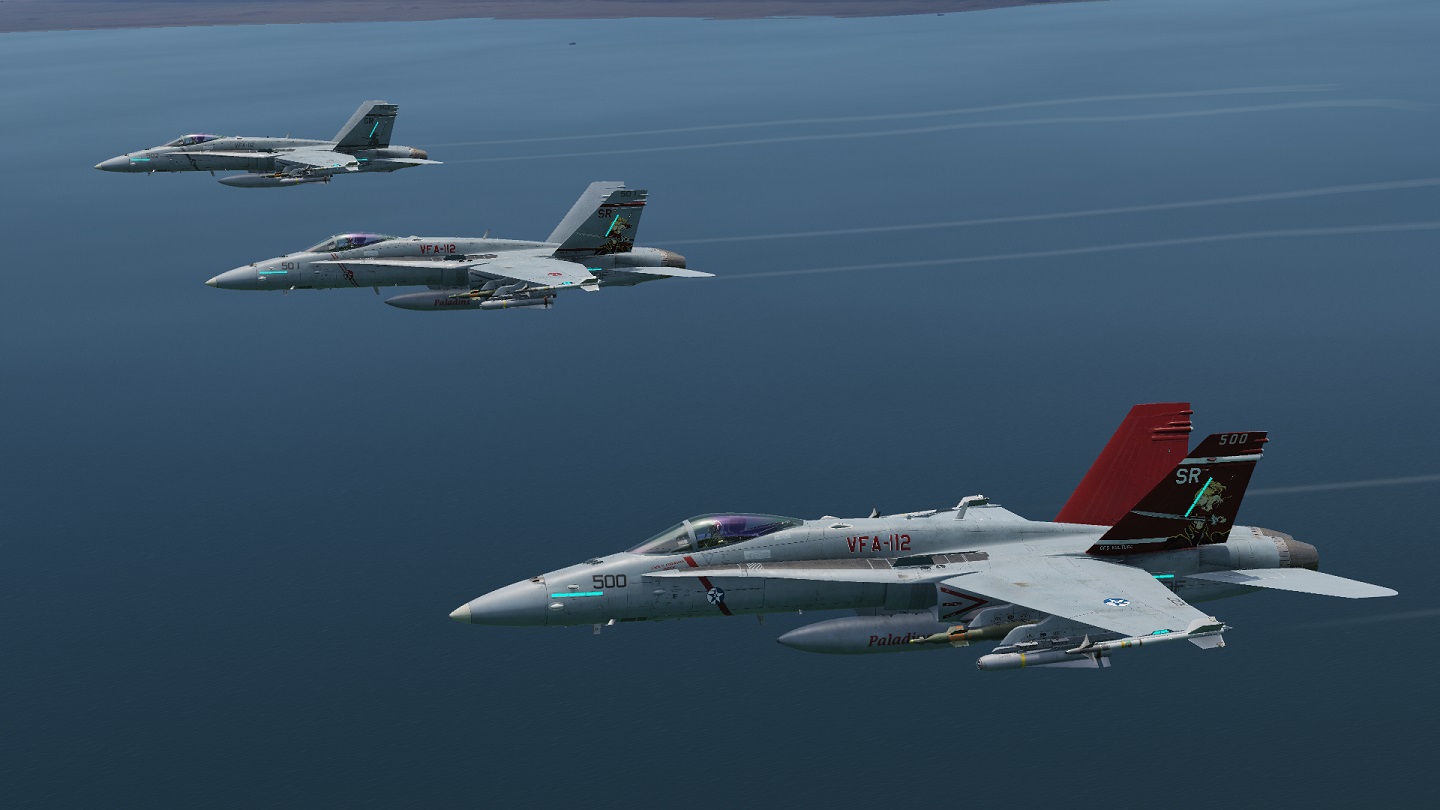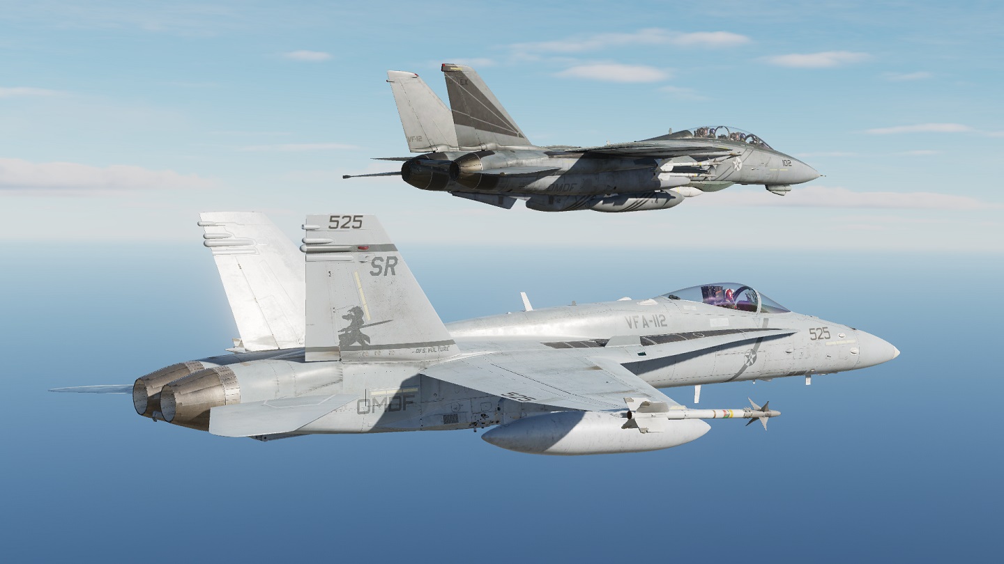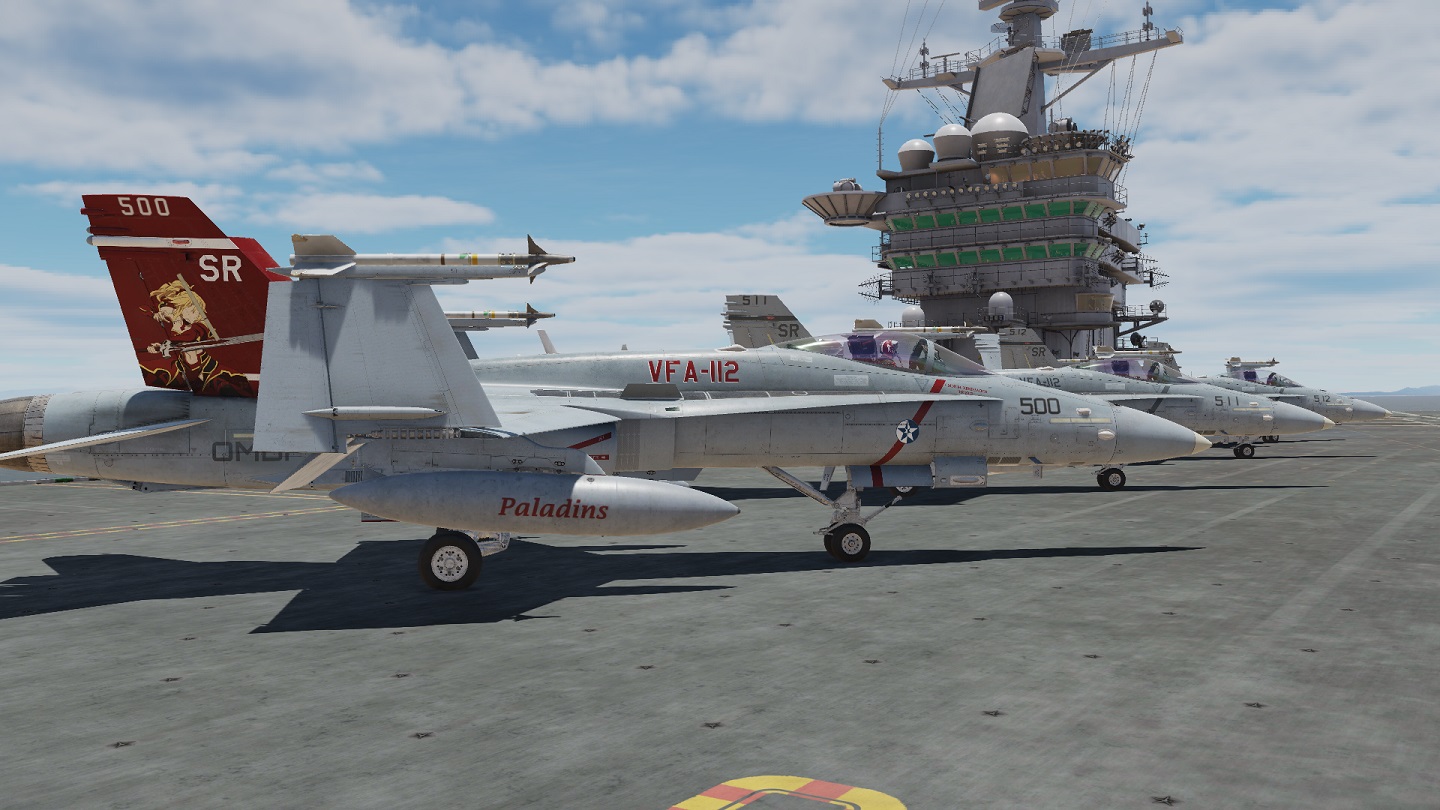 When the squadron is “chopped” to a Marine Expeditionary Unit as the core of the Air Combat Element, additional aircraft squadrons are also attached under the VMM-163 (REIN) designation and don the eponymous eyes on their own aircraft. This skin was two "What If scenarios", first being a Marine Corps Fighter Attack Squadron was attached to the Evil Eyes and wore a legacy VMM-163 flagship livery, and second, if the Marines had adopted the F-14 instead of the Hornet.