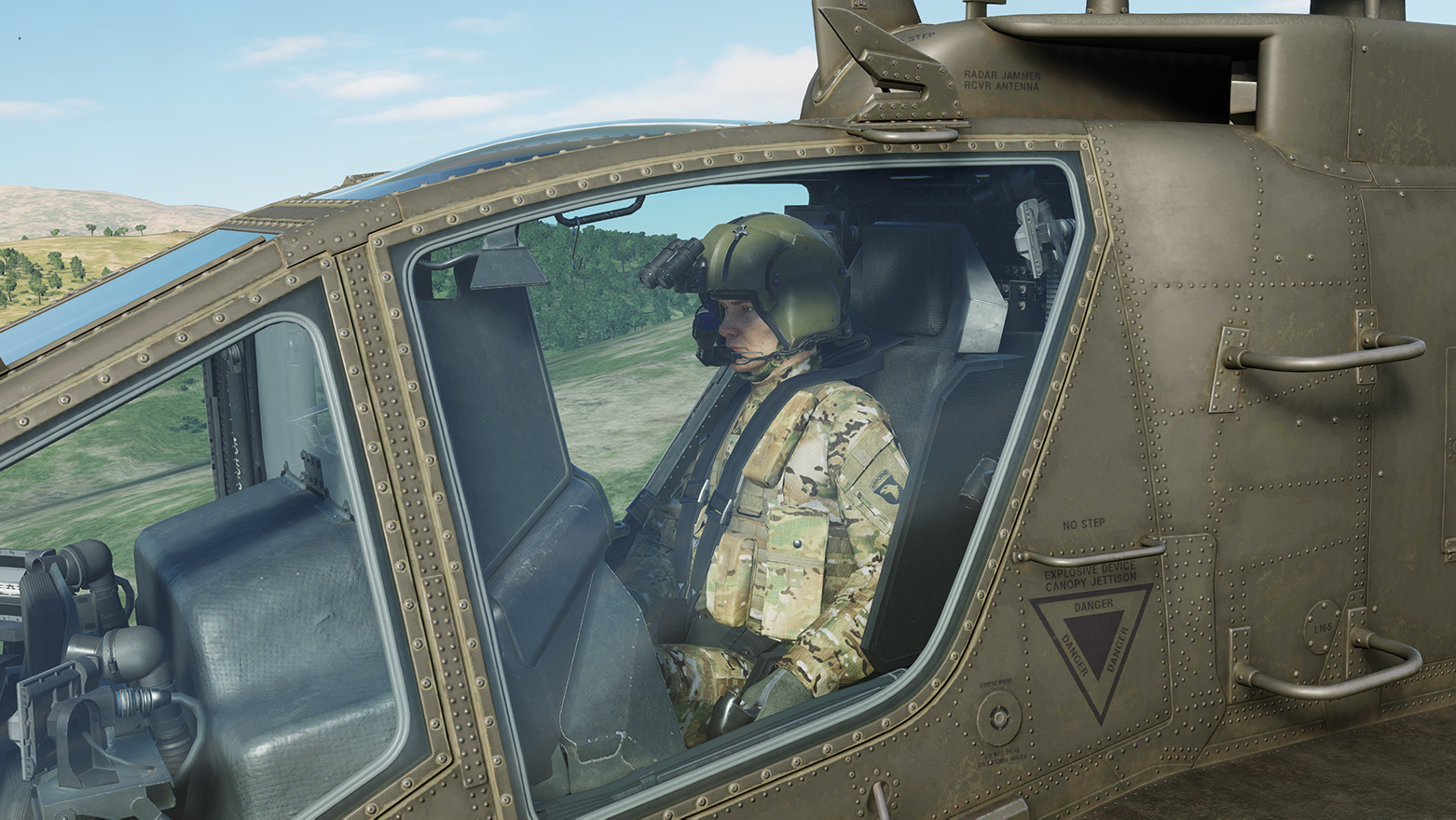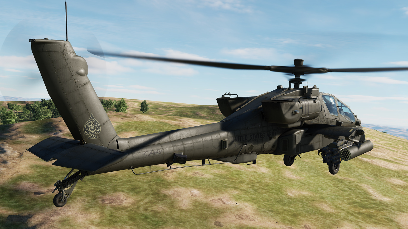 A generic AH-64D from A Co. 1-101st CAB.  The pilot and CPG are wearing OCPs instead of the default ACU pattern and have 101st Airborne Patches on both sleeves denoting unit of current assigment and "combat patch".  1-101 Decals are semi-glossy as they are IRL and the tail "spectre" is subdued and has a spraypainted appearance.