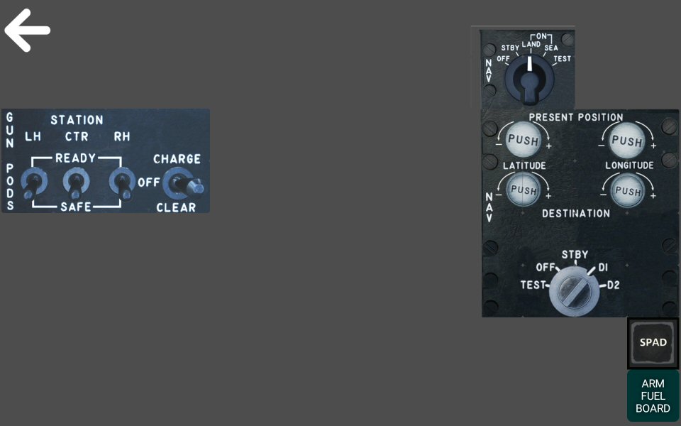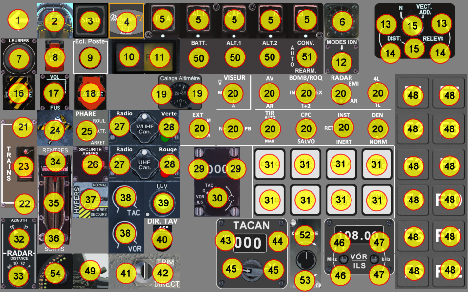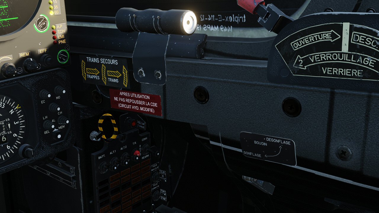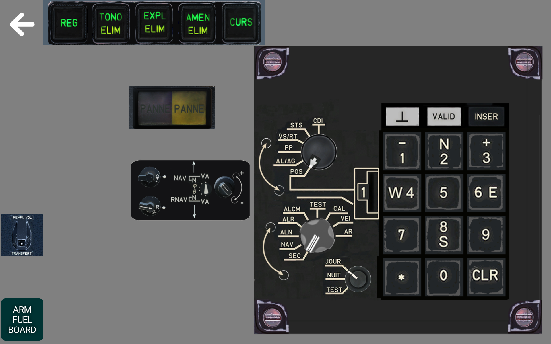 Version 4.4 : ajout sélecteur de modes radar. Version 4.3 : ajout d'une commande d'affichage du cap de l'IDN et modification des commandes d'éjection et de frein de parc. Version 4.2. Modification de la logique des voyants couplés aux interrupteurs Batterie, Alternateurs et Convertisseur. Cette interface a été réalisée avec l'objectif premier d'éviter l'usage de la souris informatique et du clavier durant les vols en utilisant des commandes déportées à portée de main du pilote pour les commandes les plus souvent utilisées en vol sur une tablette informatique Android ou Ipad par le biais du logiciel TOUCH-PORTAL.