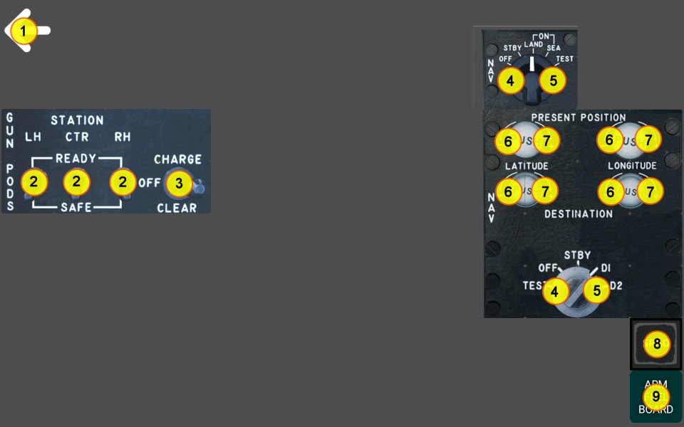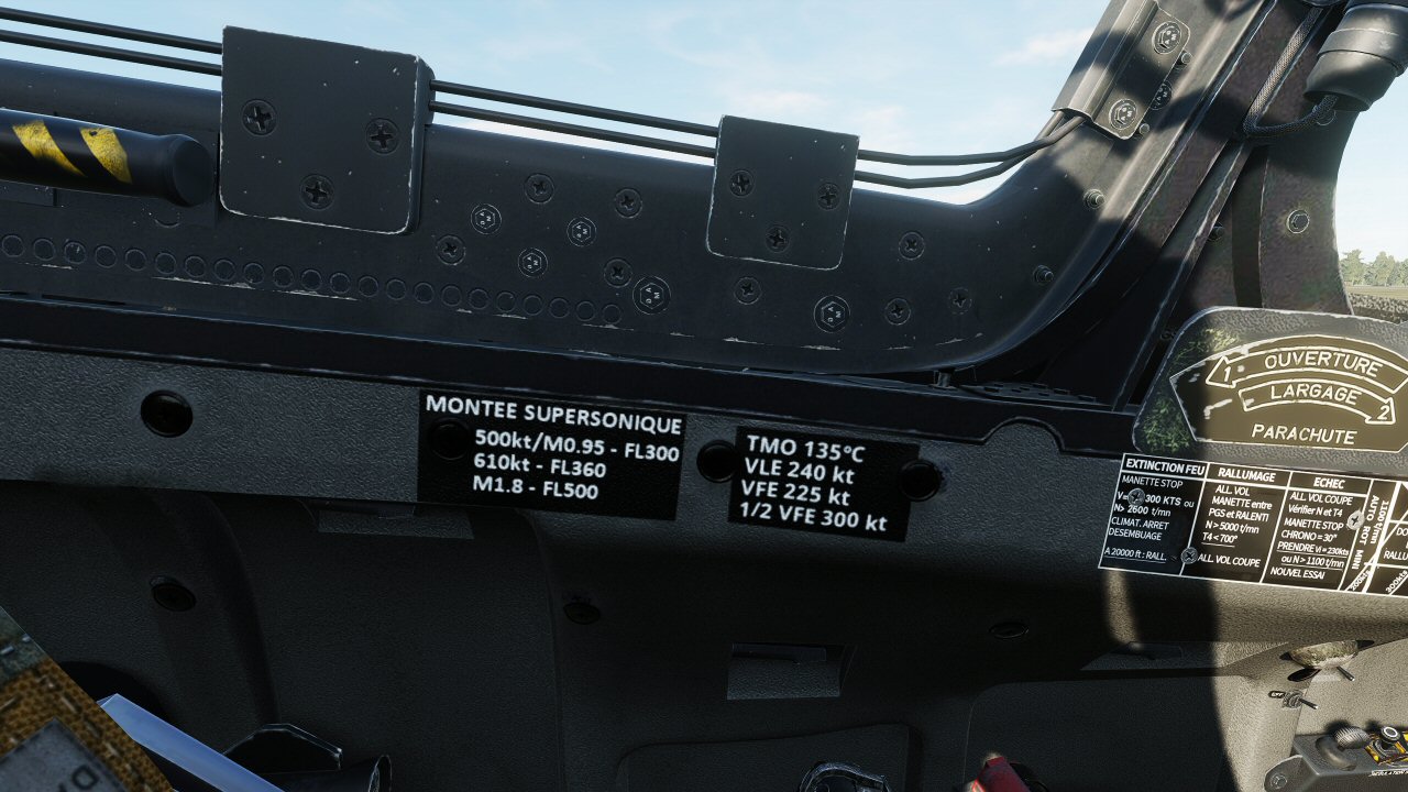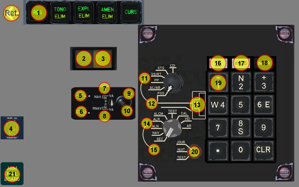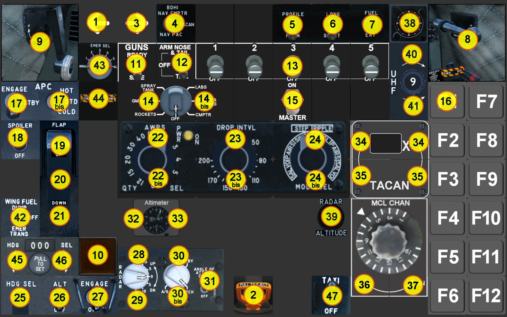 Version 4.4 : ajout sélecteur de modes radar. Version 4.3 : ajout d'une commande d'affichage du cap de l'IDN et modification des commandes d'éjection et de frein de parc. Version 4.2. Modification de la logique des voyants couplés aux interrupteurs Batterie, Alternateurs et Convertisseur. Cette interface a été réalisée avec l'objectif premier d'éviter l'usage de la souris informatique et du clavier durant les vols en utilisant des commandes déportées à portée de main du pilote pour les commandes les plus souvent utilisées en vol sur une tablette informatique Android ou Ipad par le biais du logiciel TOUCH-PORTAL.