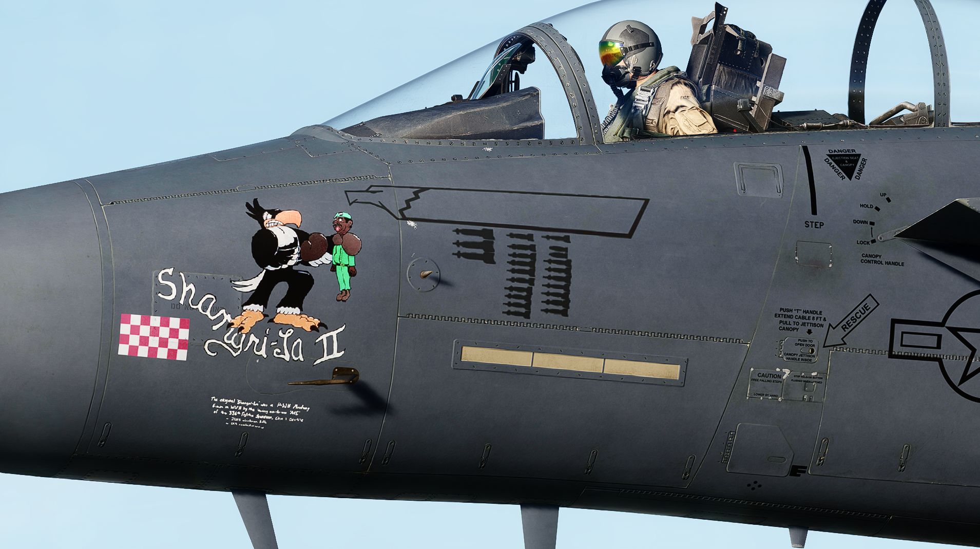 The livery has the 334ths Eagle on the Left nose, on the Right nose it has the 3 old Eagle squadrons from the RAF. On the tail you can find the North carolina state with a Star making the Seymour Johnson AFB, on the Other Stab you can find Col. Don Blakeslee