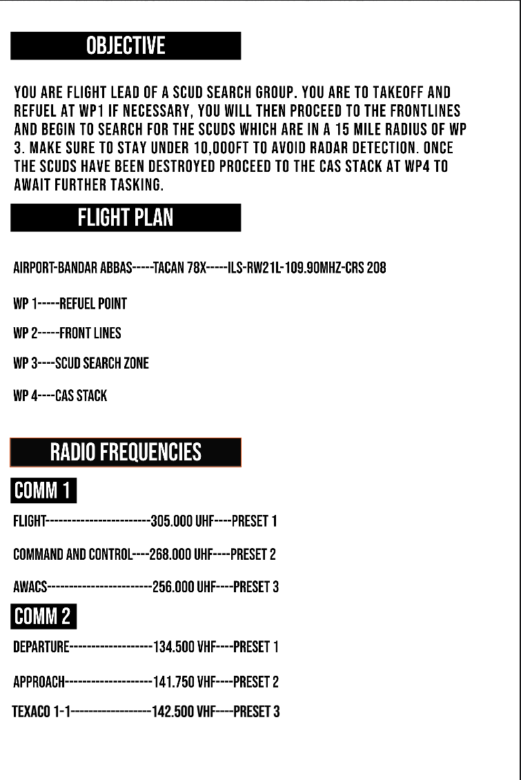 A strike mission set in a semi fictional Desert Storm Operation. You will be sent out to locate and destroy a SCUD team and remain on duty for tasking. You are armed with 8 GBU-12s, 2 Aim-120Bs, and 2 Aim-9Ms along with 2 external fuel tanks. Be aware of enemy fighters in the area and stay clear of Iraq's radars to avoid detection.