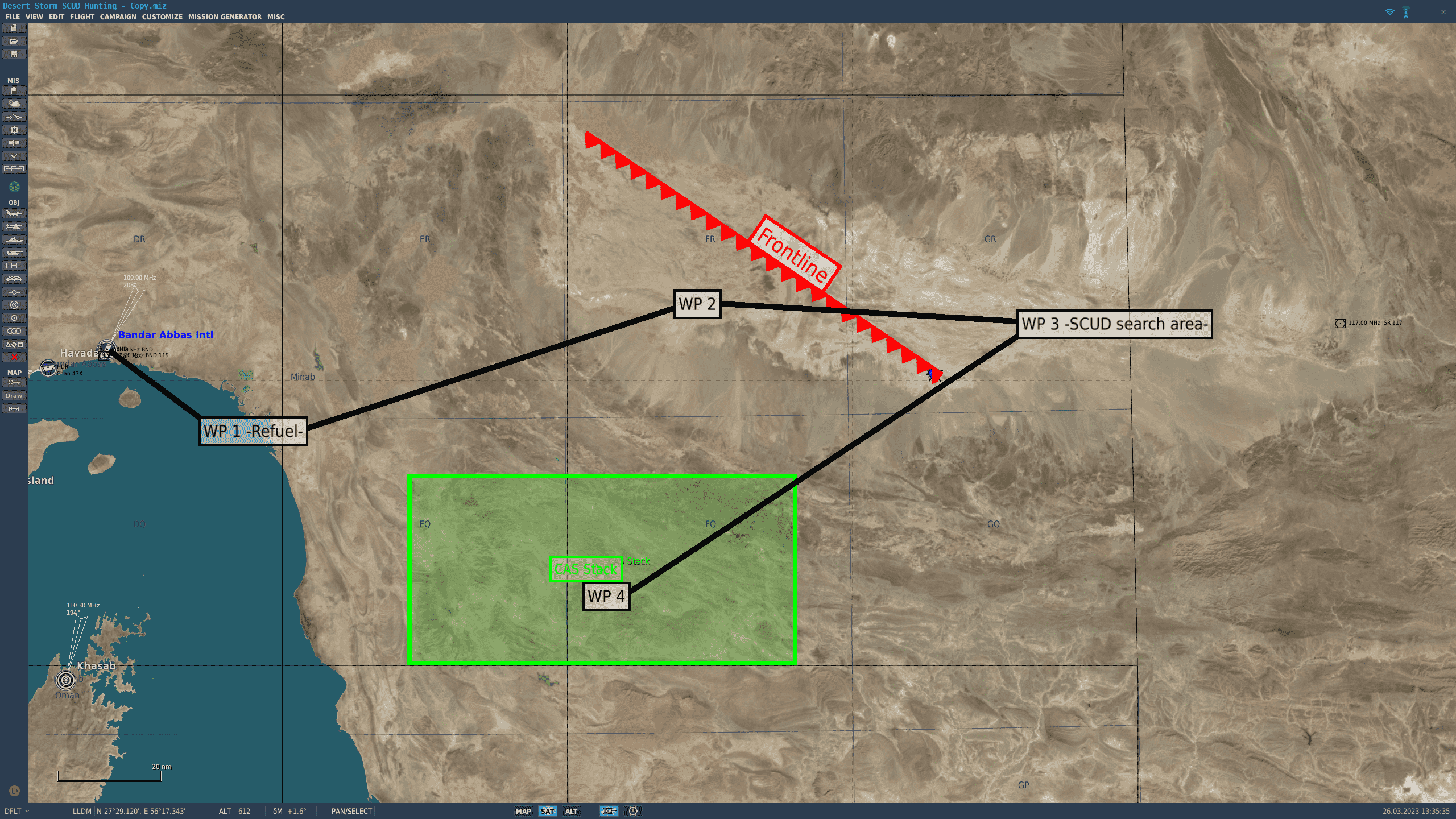 A strike mission set in a semi fictional Desert Storm Operation. You will be sent out to locate and destroy a SCUD team and remain on duty for tasking. You are armed with 4 GBU-12s, 2 Aim-120Bs, and 2 Aim-9Ms along with 3 external fuel tanks. Be aware of enemy fighters in the area and stay clear of Iraq's radars to avoid detection.