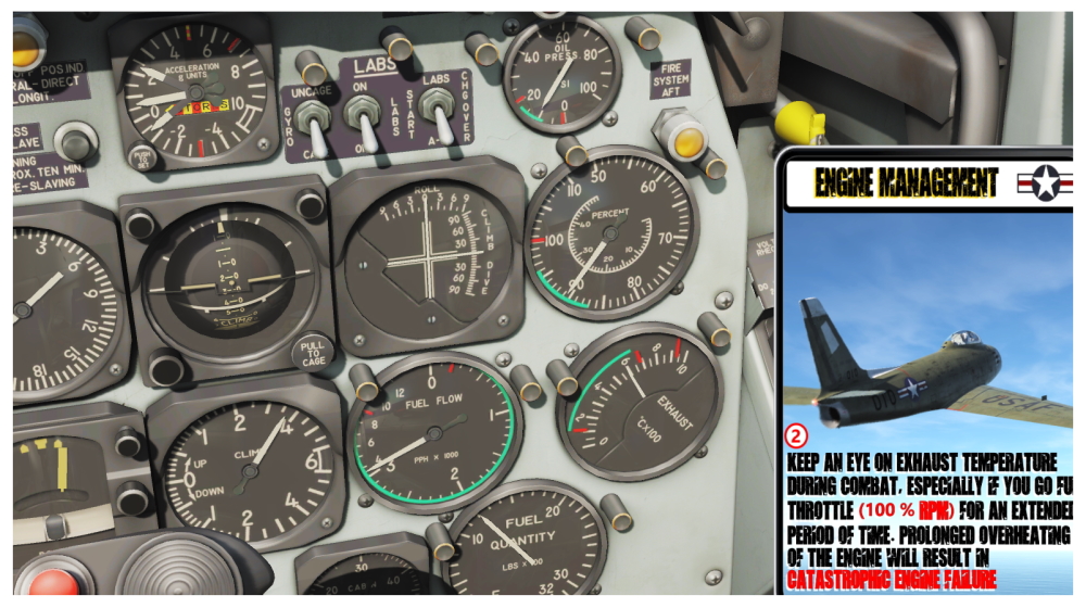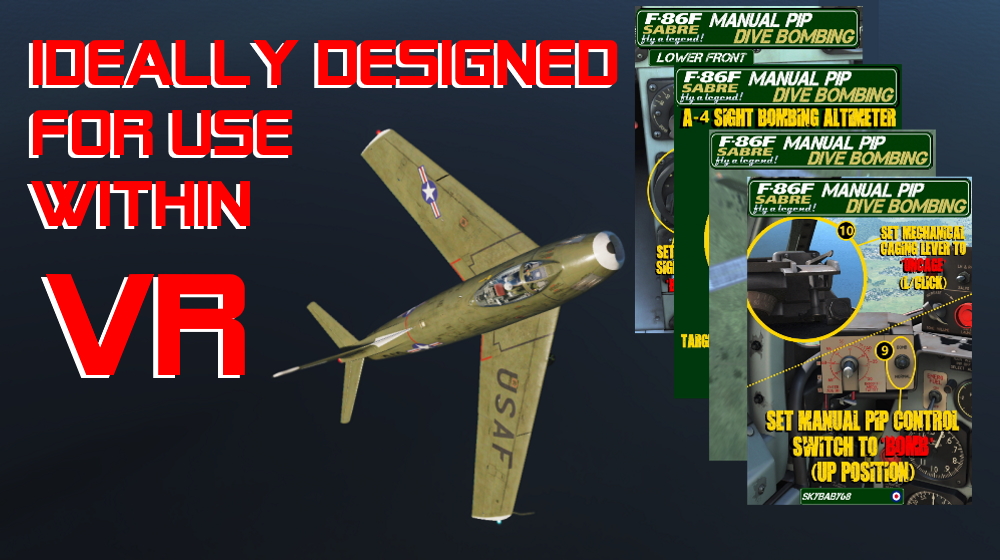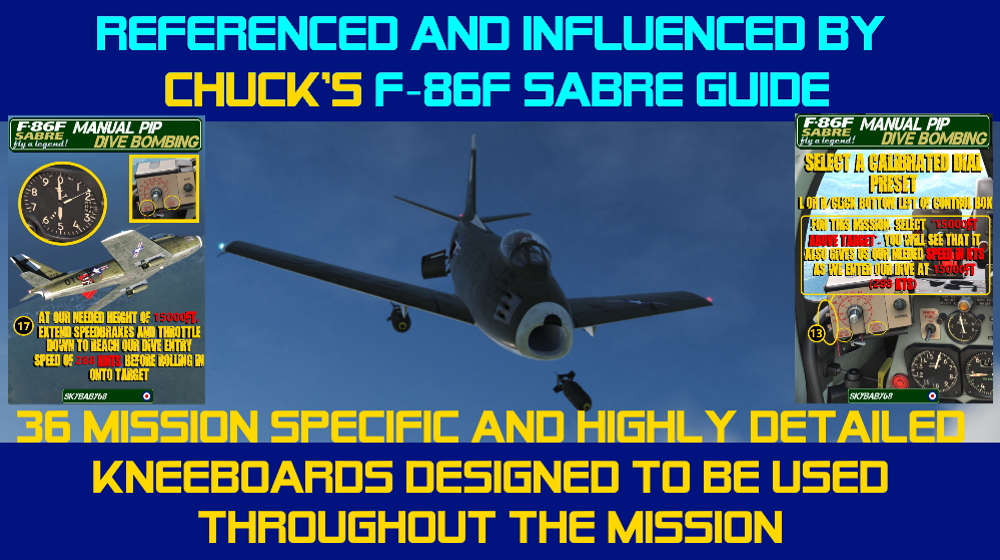 Manual PIP Bombing Training Mission for the F-86F Sabre. Being a VR pilot, I'm creating a series of custom kneeboards which have been largely inspired from Chuck's amazing guides. I wanted to be able to learn-as-I-go from within the headset and the mission-specific kneeboard missions also act as a handy 'refresher' when you come back to a module after a time away. This particular training mission flight contains 36 kneeboard plates covering TAKEOFF, SETTING UP AND HOW TO DEPLOY AN-M64 BOMBS IN MANUAL PIP MODE and LANDING.