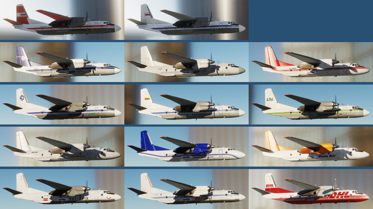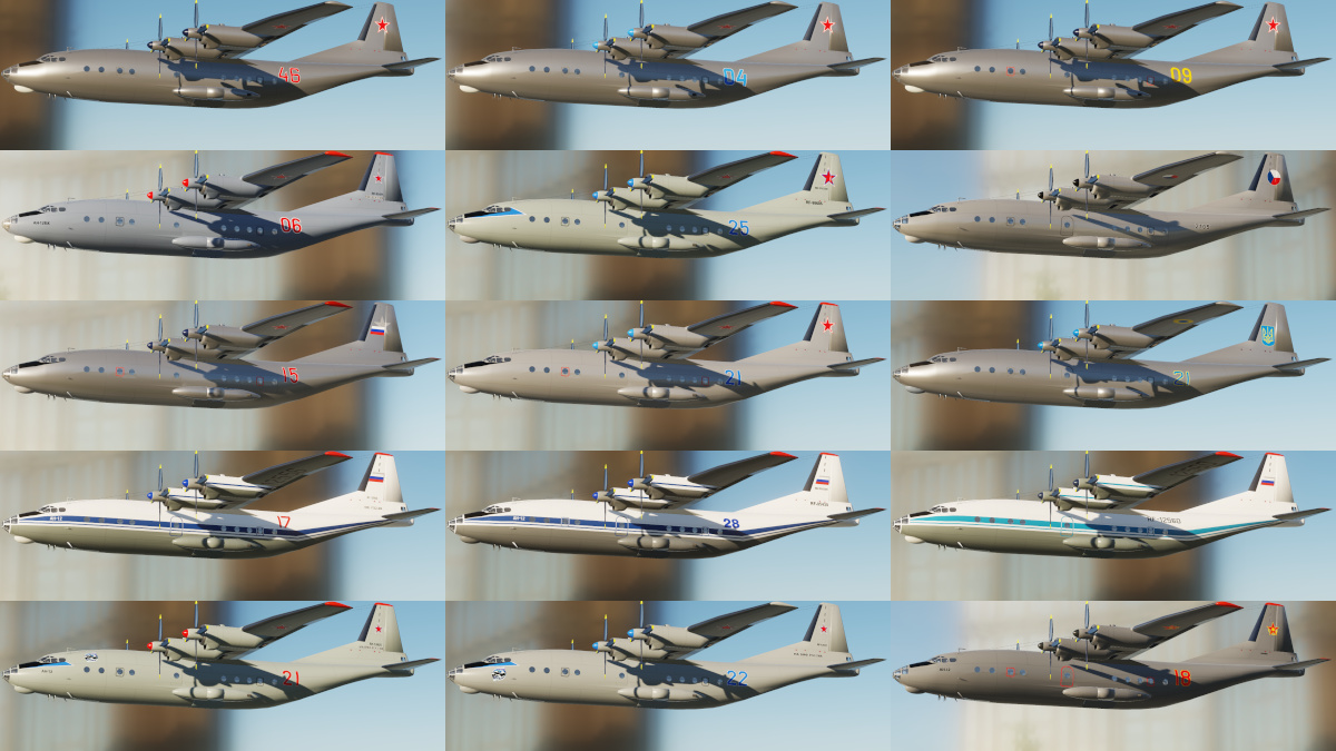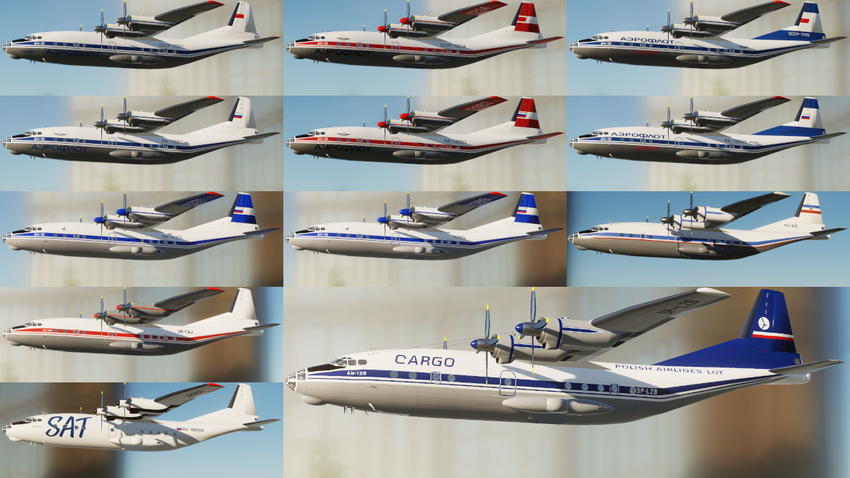 Historical skinpack of 16x Air Force / Naval Aviation / Government + 11x commercial airlines = total 27 liveries for An-12 AI mod by walrusw and helijah.