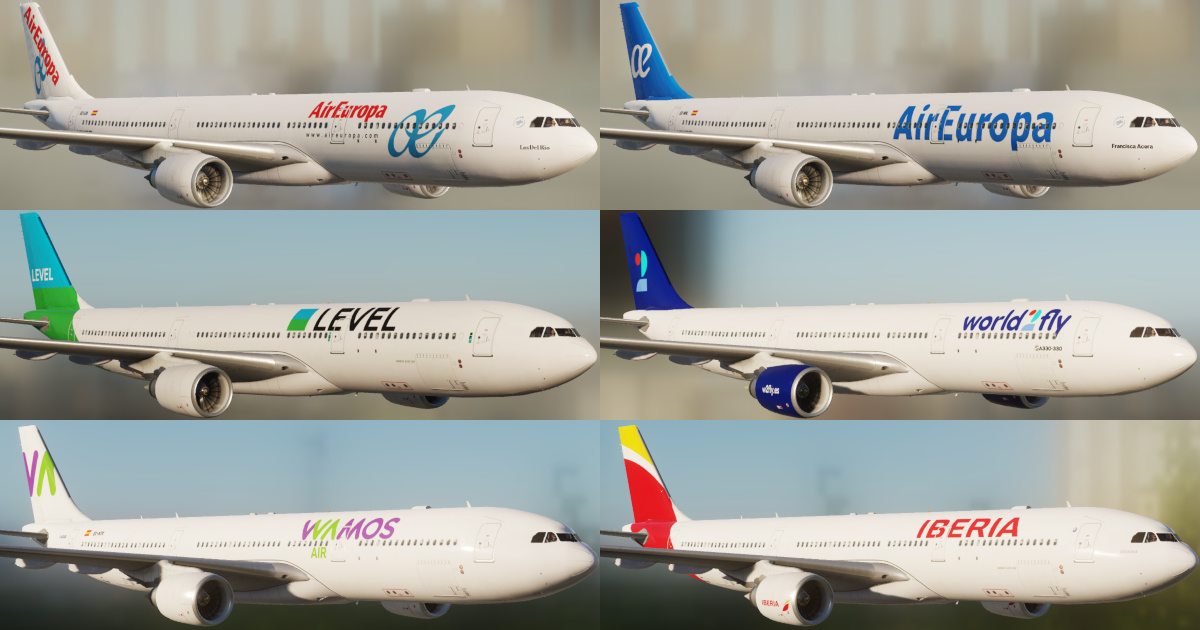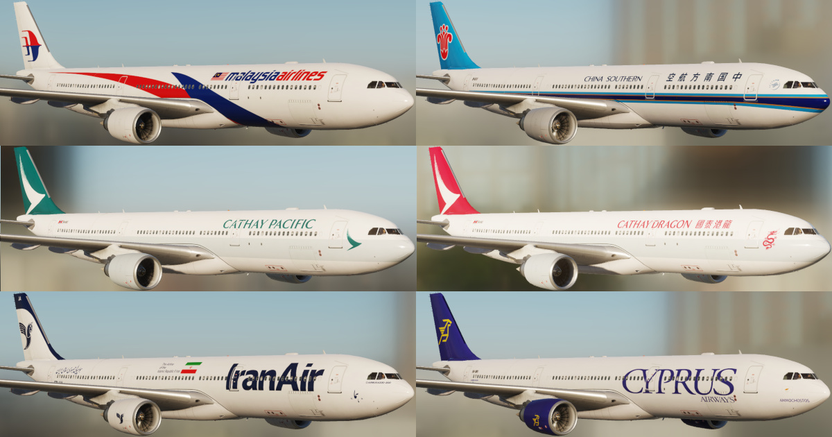 Air France, Air Europa, British Airways, Cathay Pacific + Cathay Dragon, China Southern, Cyprus Airways, Iberia, IranAir, LEVEL, Lufthansa, Malaysia Airlines, Saudia, Wamos Air and World2fly --- 15x airlines' 18 liveries.