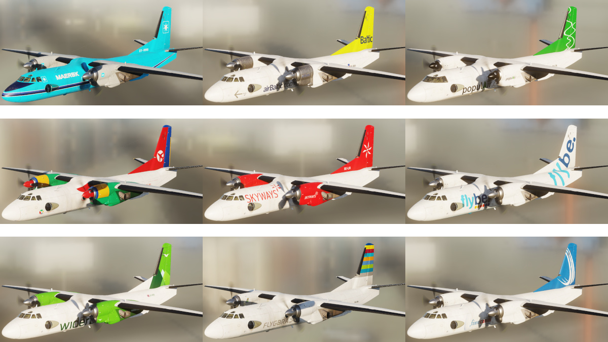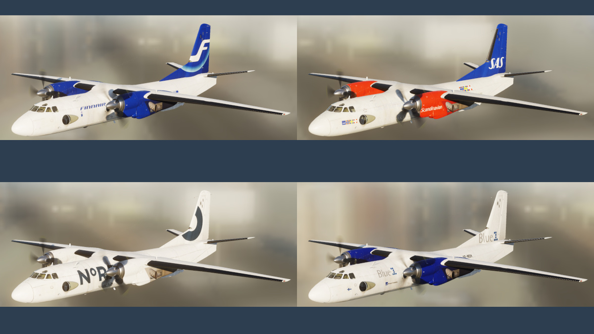 Nordic airlines' fake skinpack. Historical ATR 42/72, DHC-8 family, Fokker 50 or F27 liveries are imitated on ED's An-26B model.