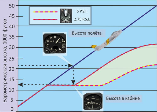 Давление в кабине поддерживается потоком воздуха из вентиляционных отверстий и устанавливается регулятором перепада давления в зависимости от высоты полёта. Чем больше высота полёта, тем больше перепад давления (разность "высот") в кабине пилота для поддержания нормальной жизнедеятельности.