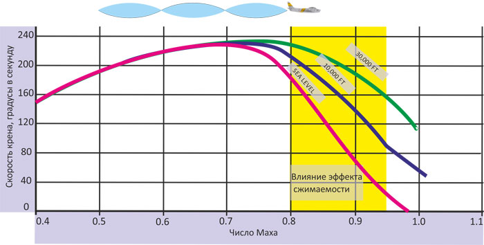 Причина: Развивающийся кренящий момент (wing heaviness) при значительном снижении эффективности элеронов (на больших числах Маха) и дополнительный изгиб и кручение крыла под действием воздушного потока при отклонении элерона (wingroll).